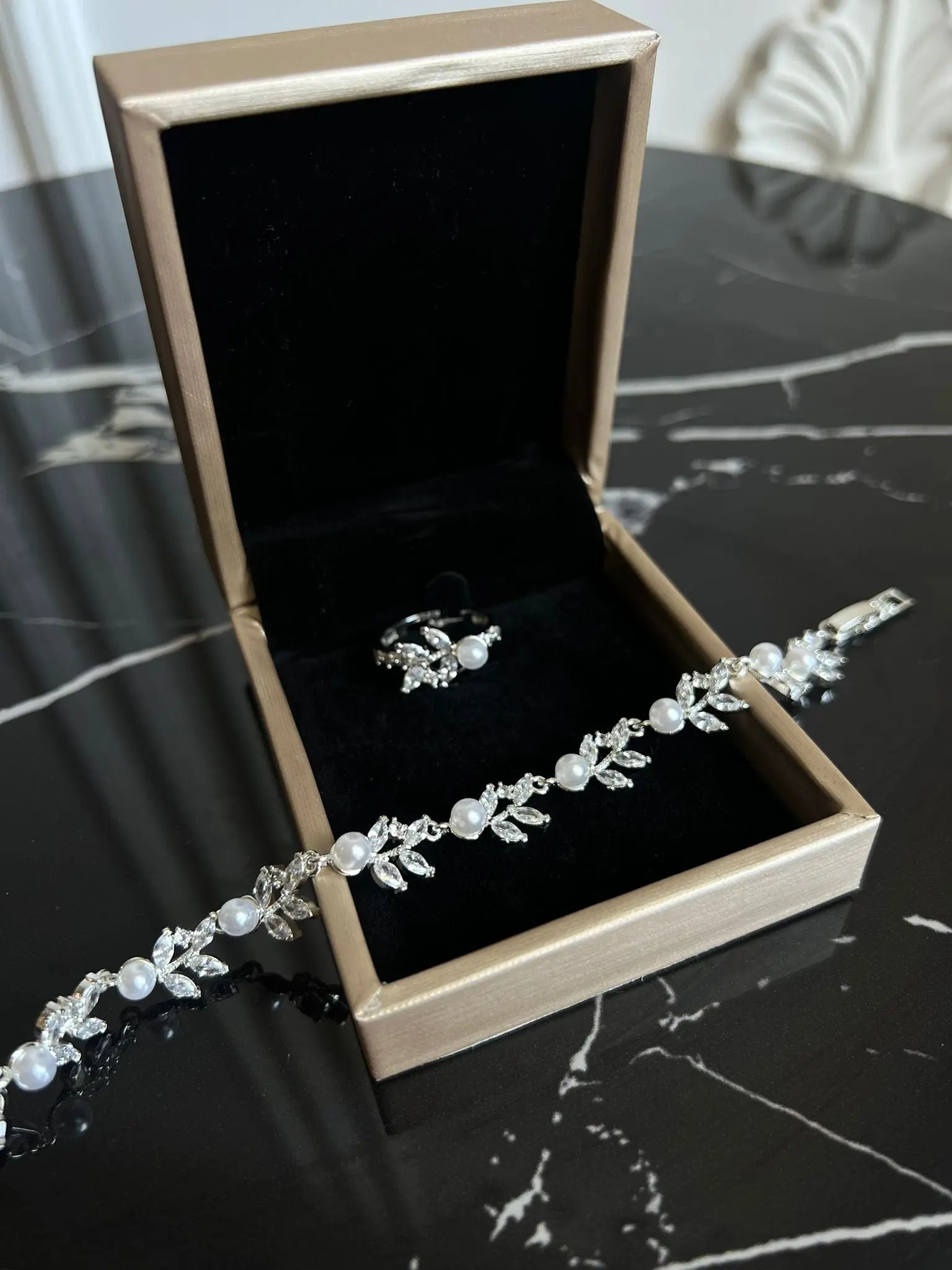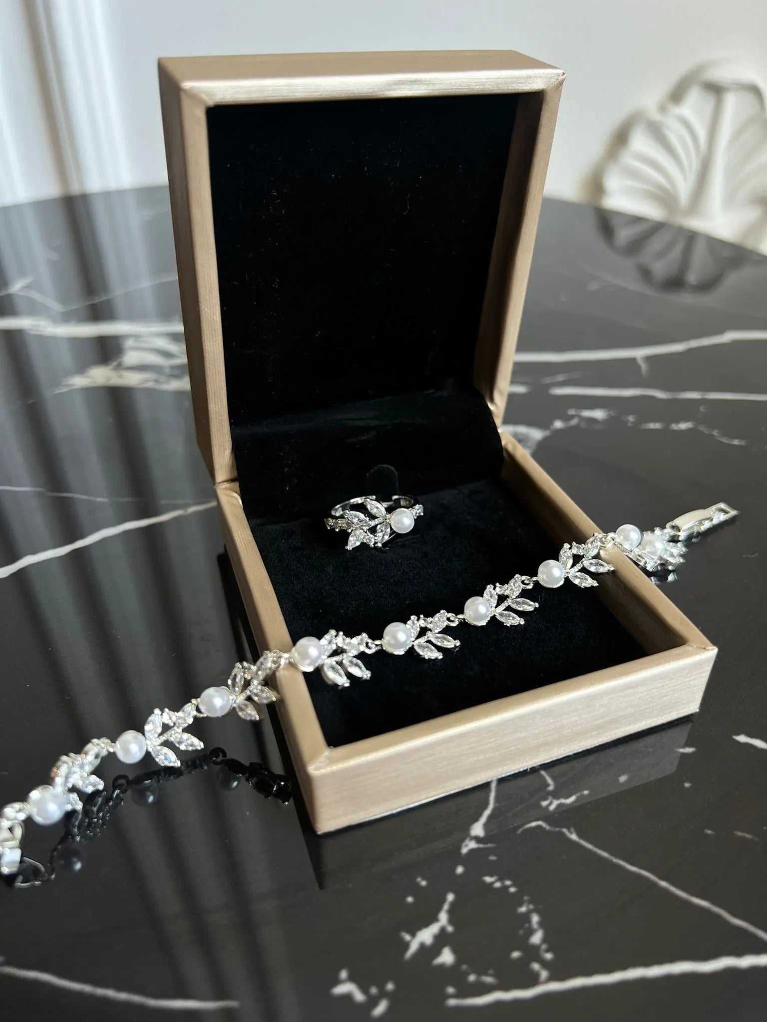 Set bratara si inel Paloma, placat aur alb, zirconiu cubic AAA, perle