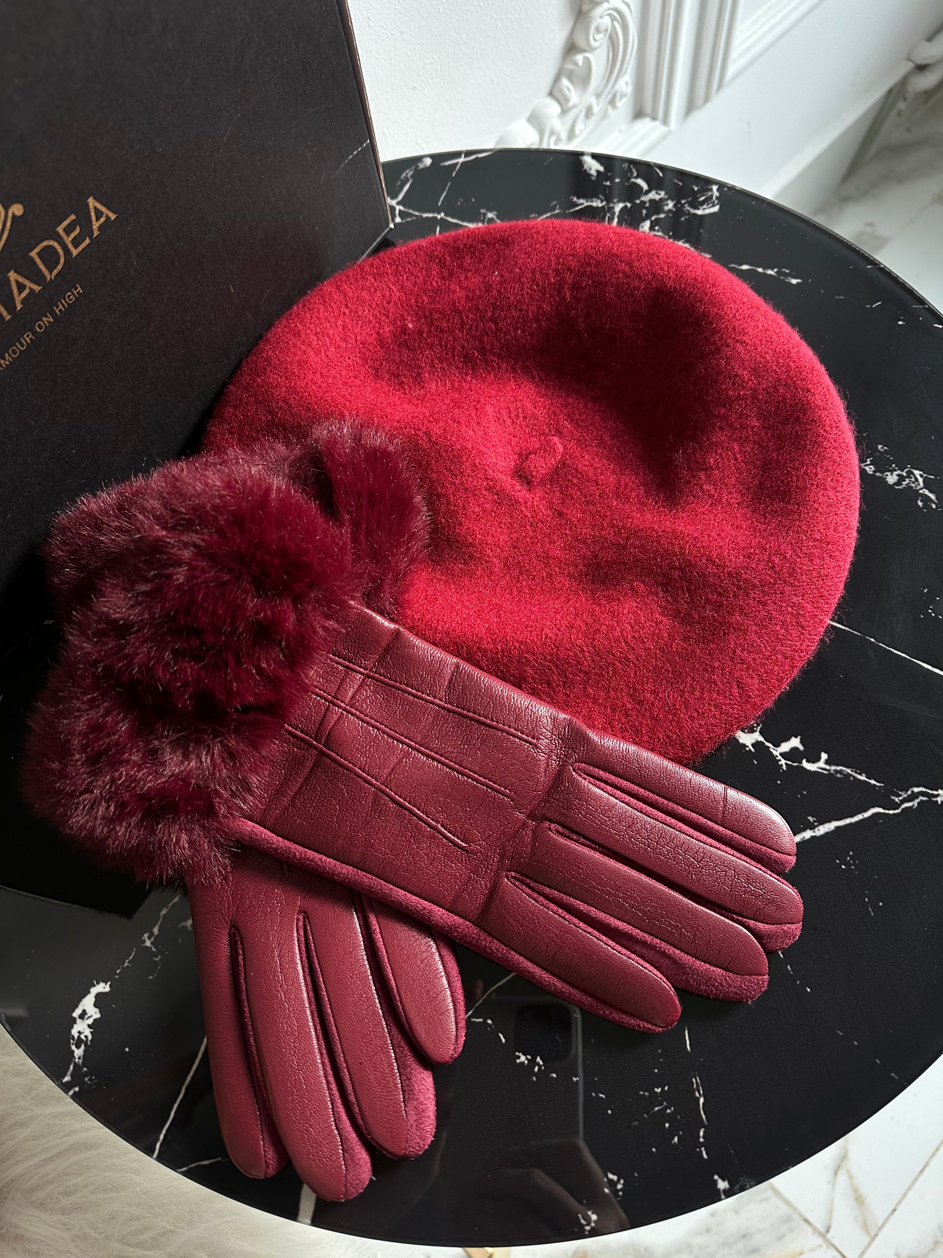 Set cadou bereta din bumbac si manusi din piele ecologica cu blanita – culoare burgundy