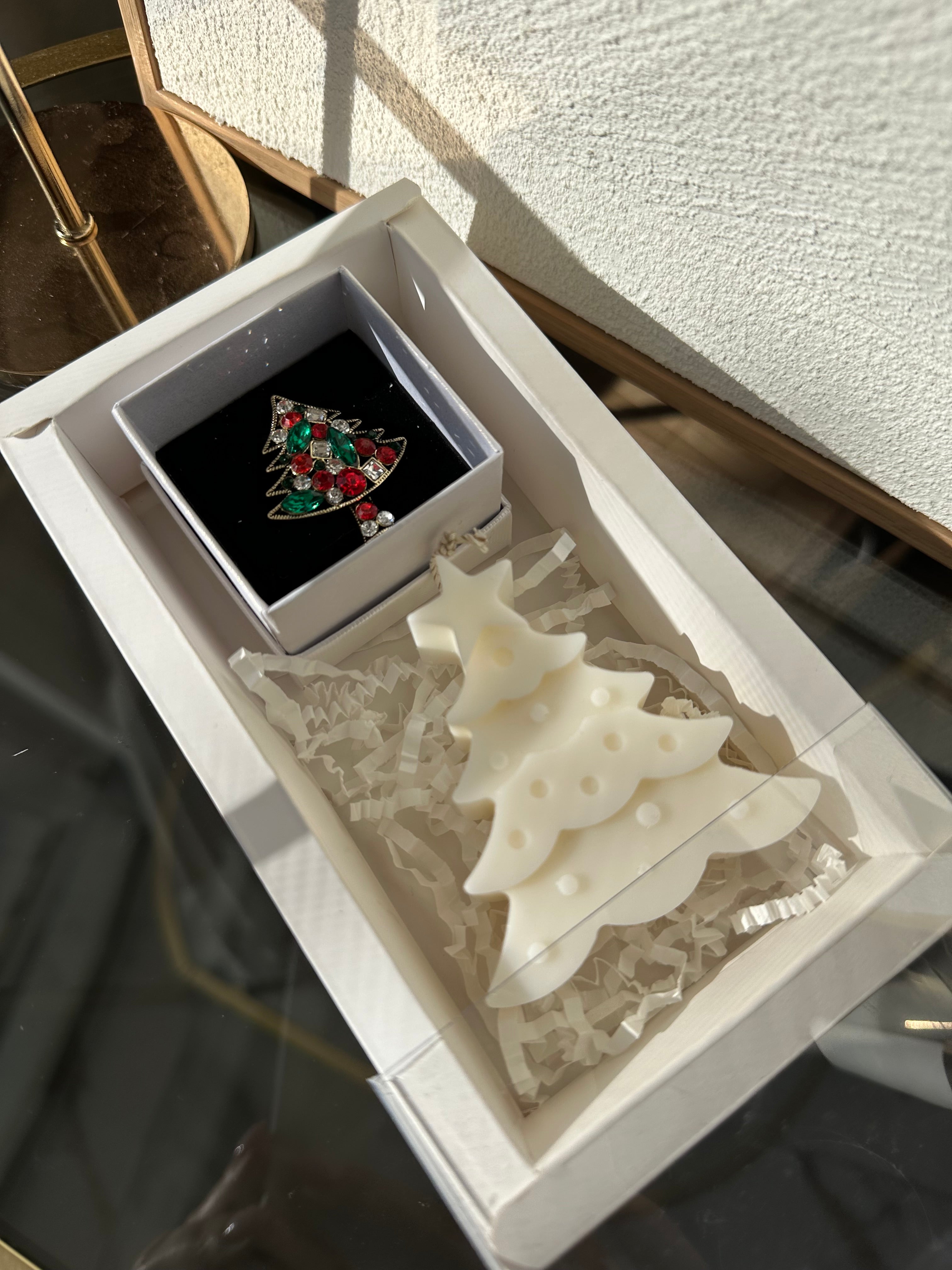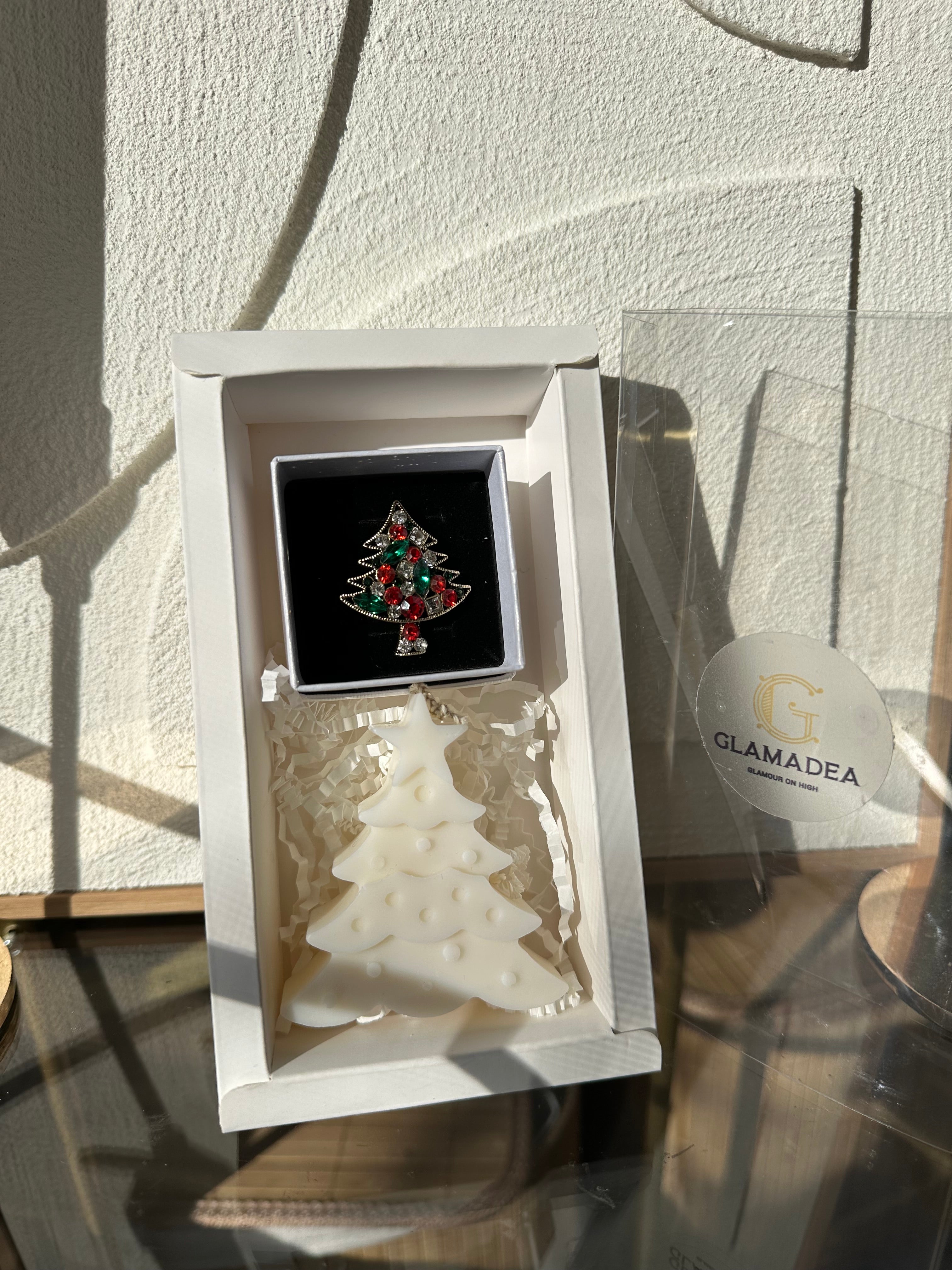 Set Cadou de Sărbători – Broșă Tematică & Lumânare Parfumată din Soia în Formă de Brăduț