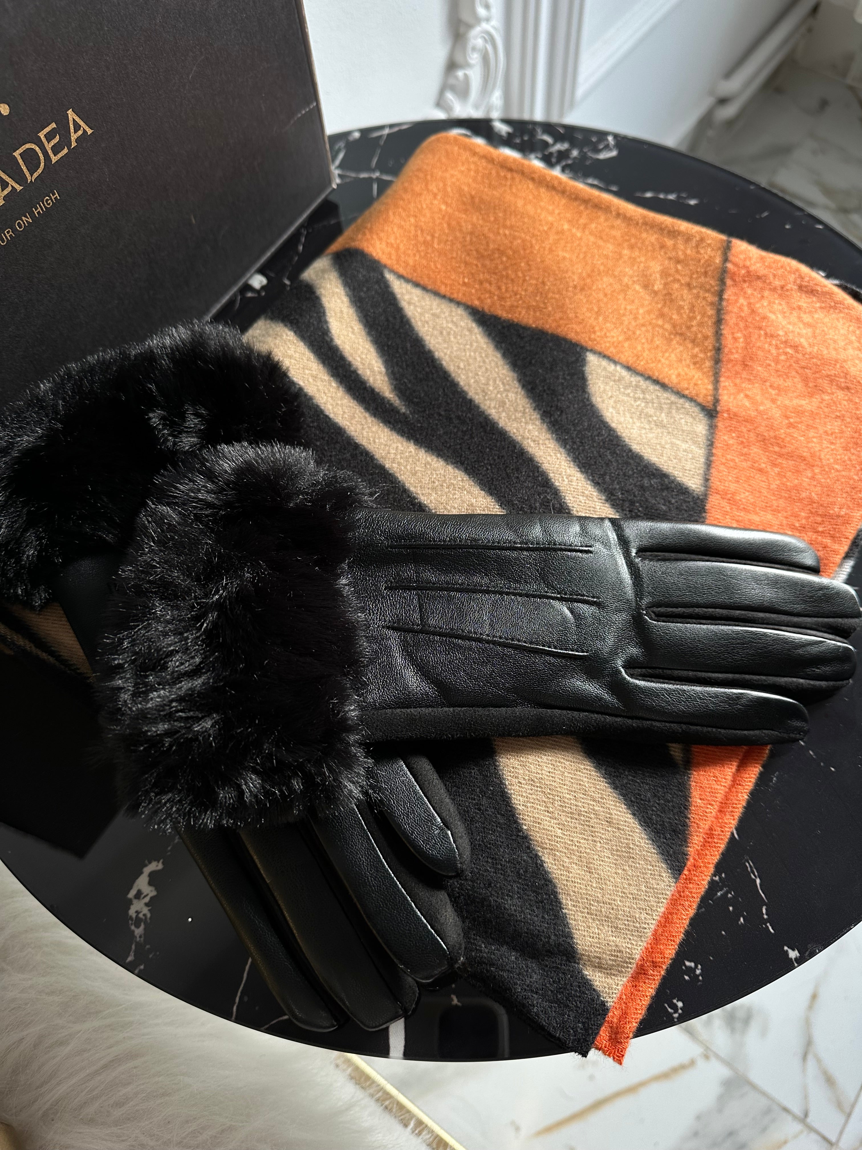 Imbinarea dintre imprimeul animalic si textura delicata a esarfei, alaturi de manusile elegante, creeaza un set echilibrat si plin de stil, ideal pentru sezonul rece.