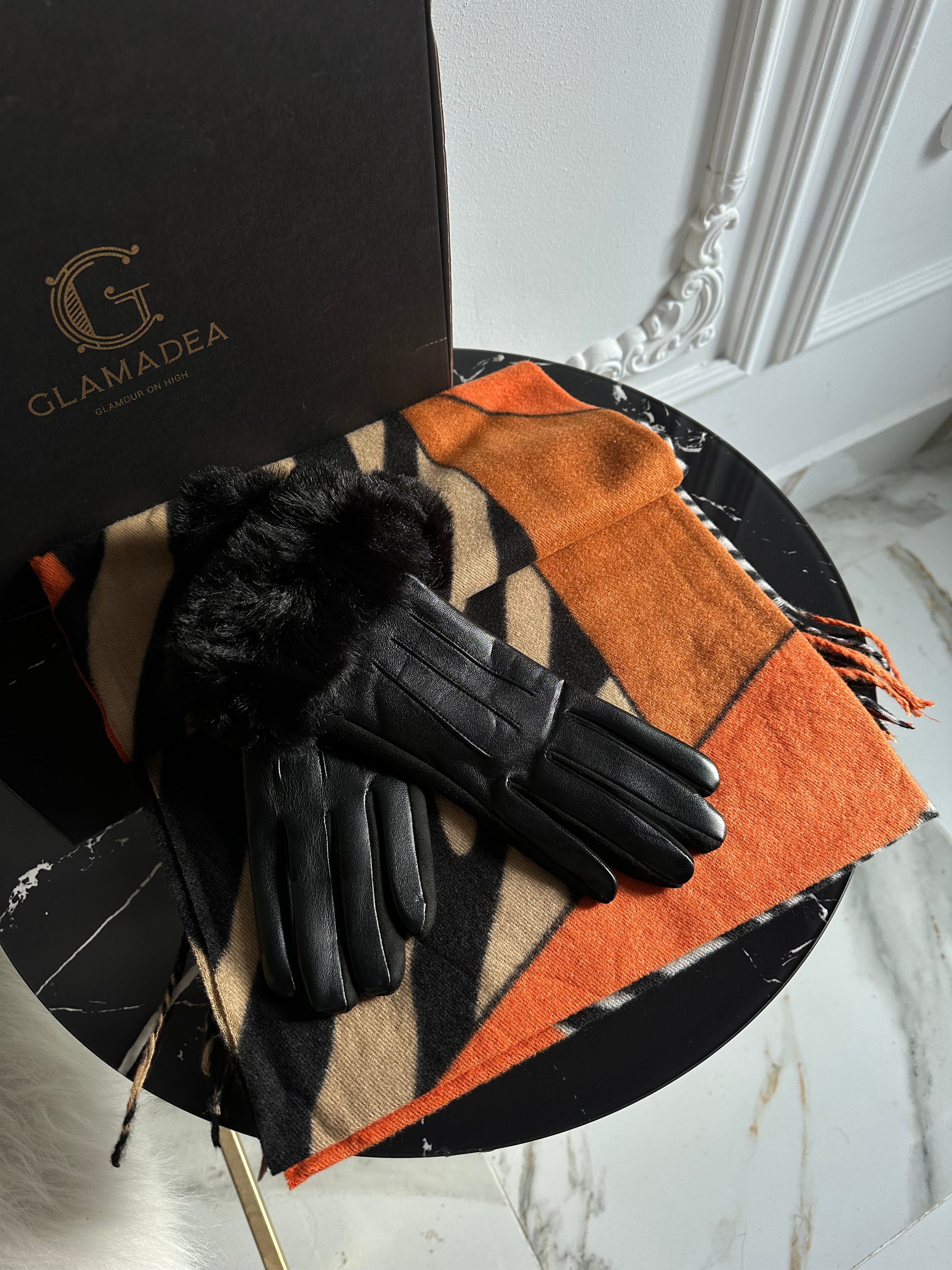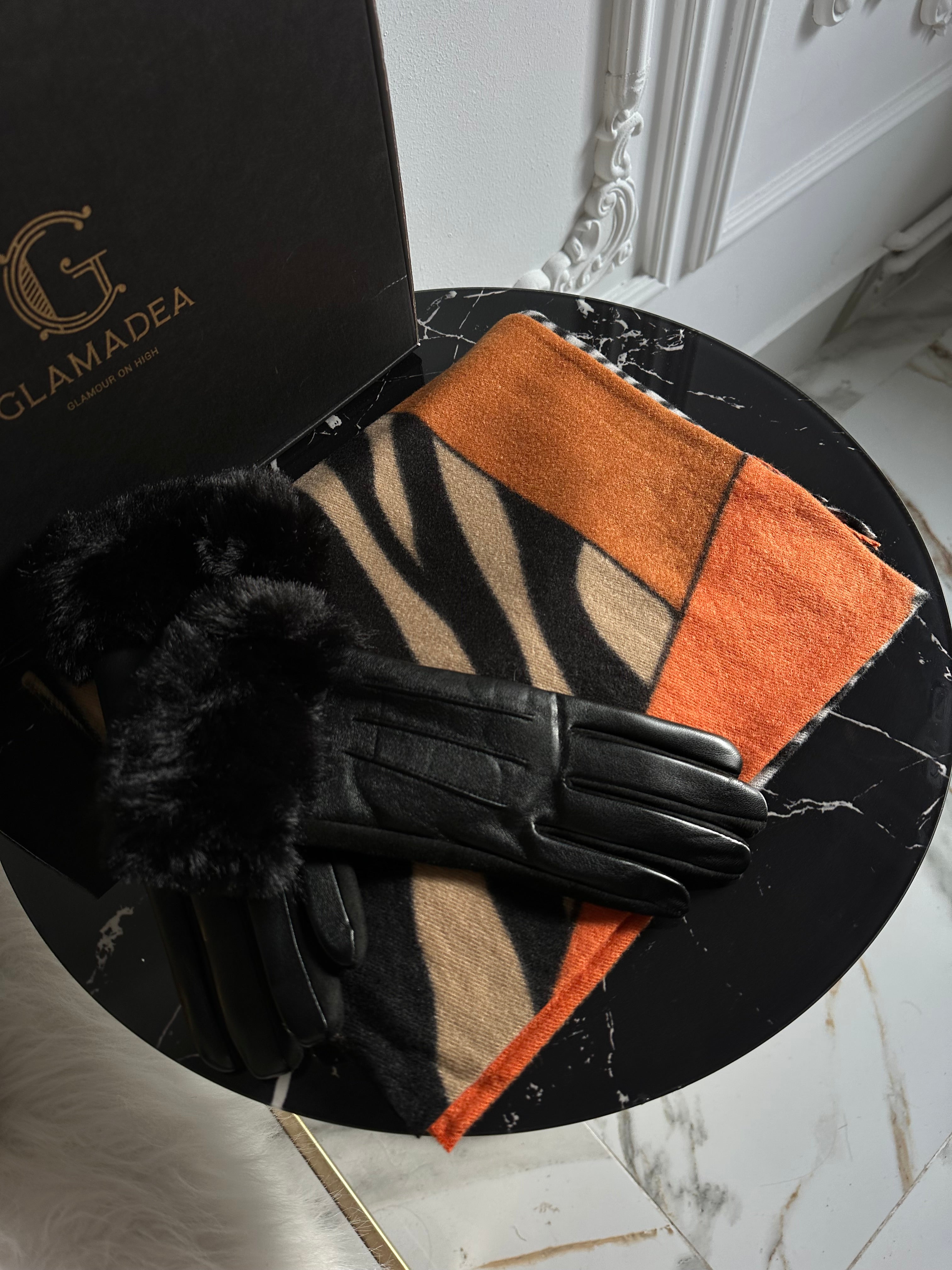 Set cadou esarfa animal print cu portocaliu, negru, alb si nude din cashmere–bumbac–vascoza si manusi din piele ecologica cu blanita
