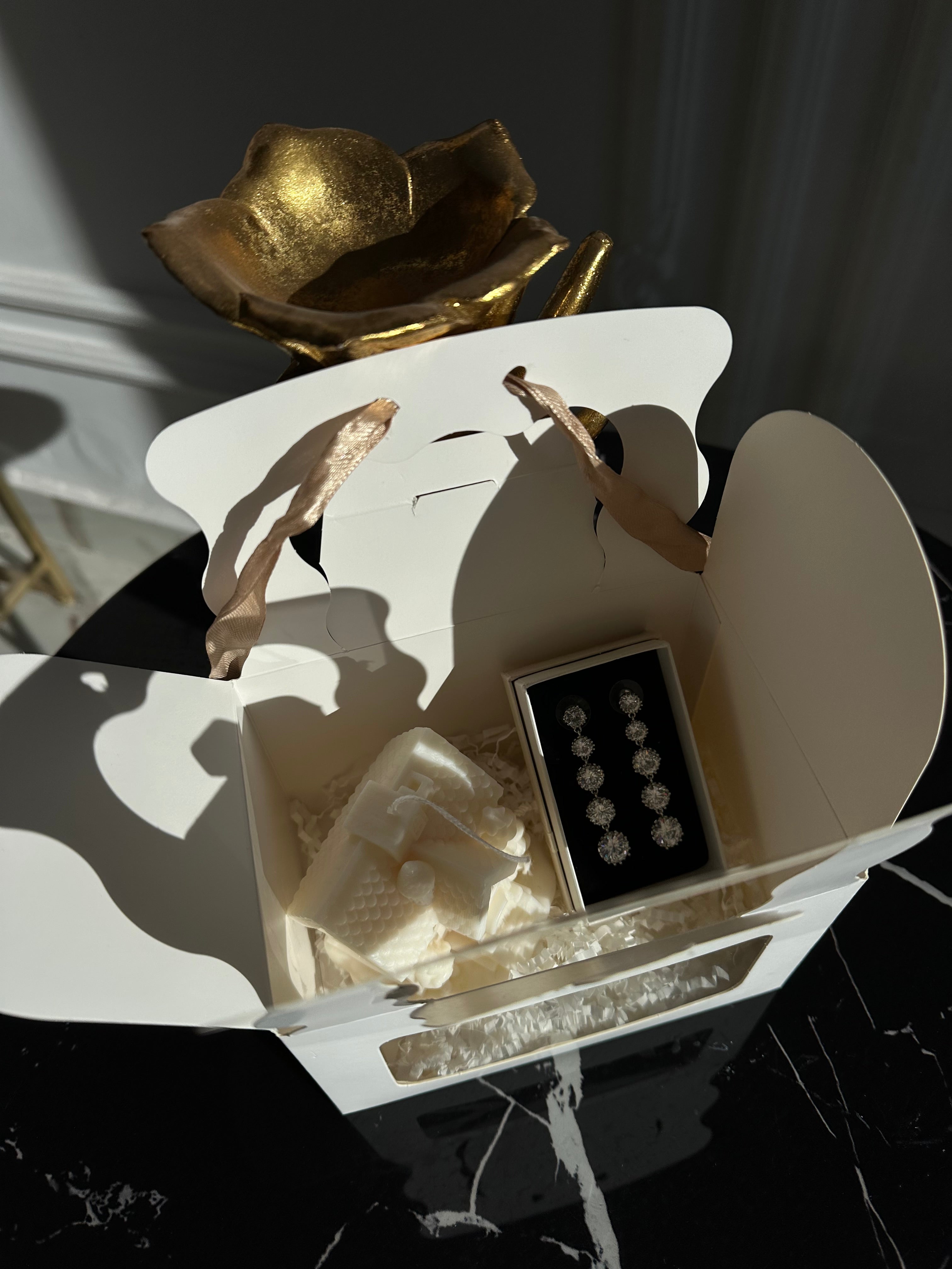 Surprinde in sezonul sarbatorilor cu un cadou elegant si plin de caldura. Setul Glamadea combina o pereche de cercei lungi, delicati si rafinati, perfecti pentru tinute festive sau seri speciale, cu o lumanare artizanala turnata manual din ceara naturala de soia, parfumata cu esente naturale si realizata intr-o forma adorabila de casuta.