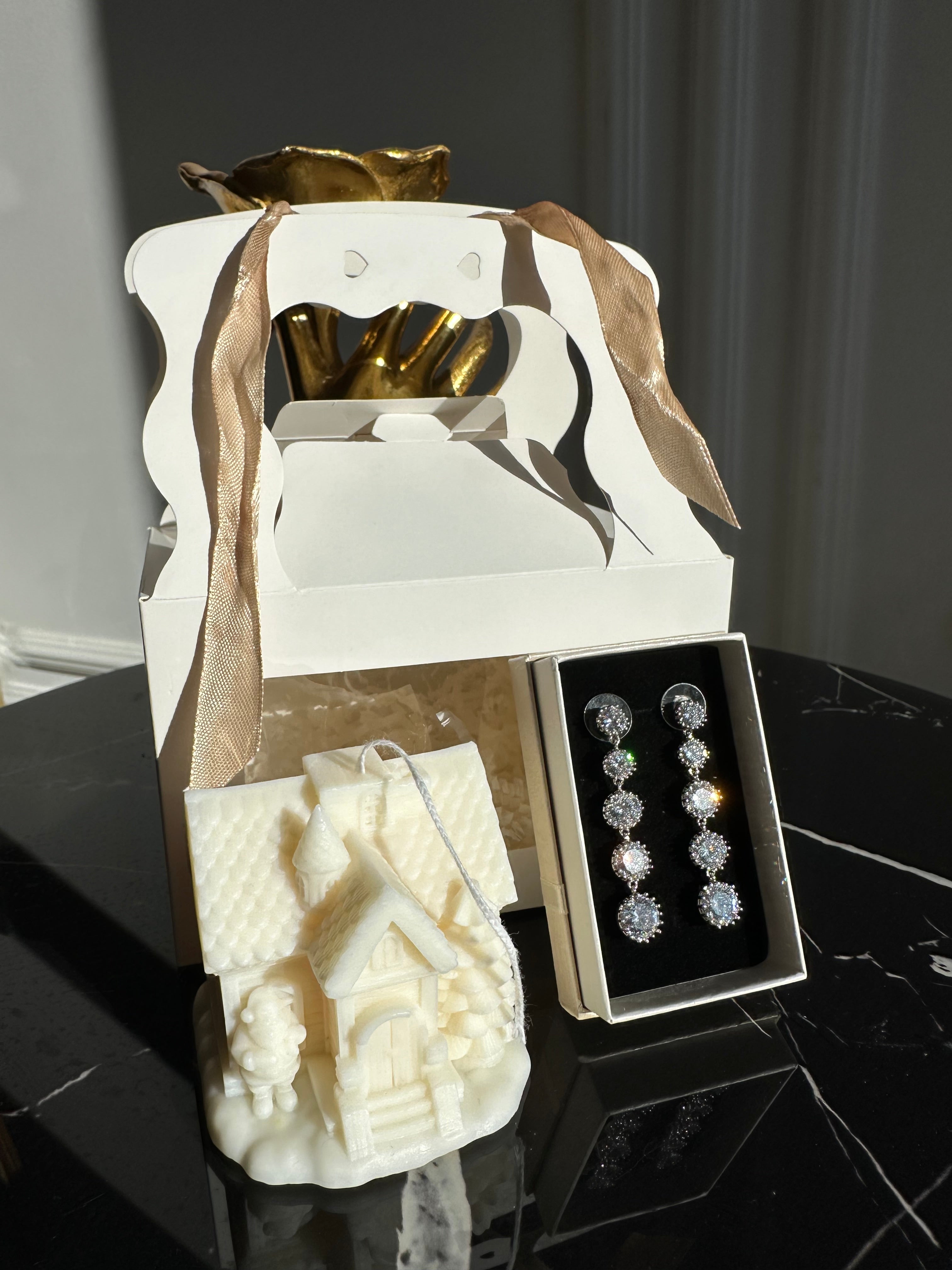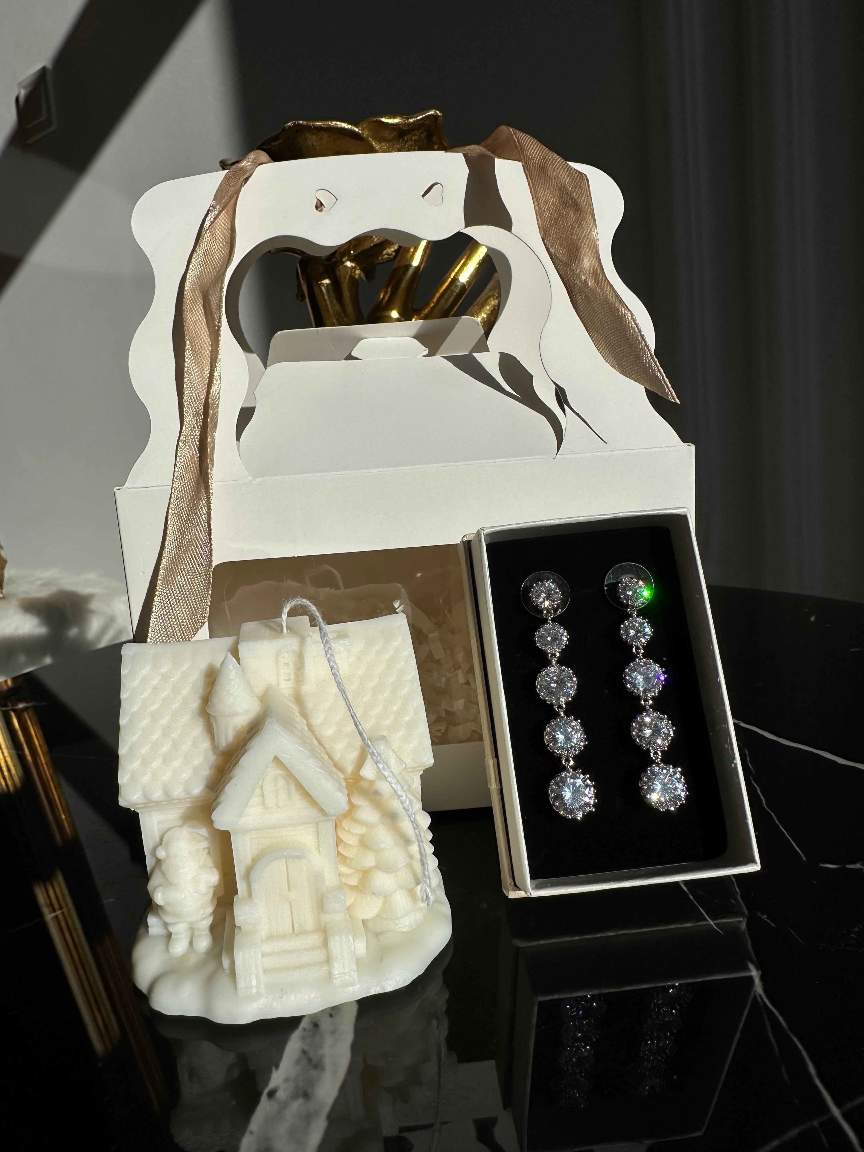 Set Cadou Sarbatori Glamadea – Cercei Lungi Eleganti & Lumanare Casuta din Ceara de Soia Naturala