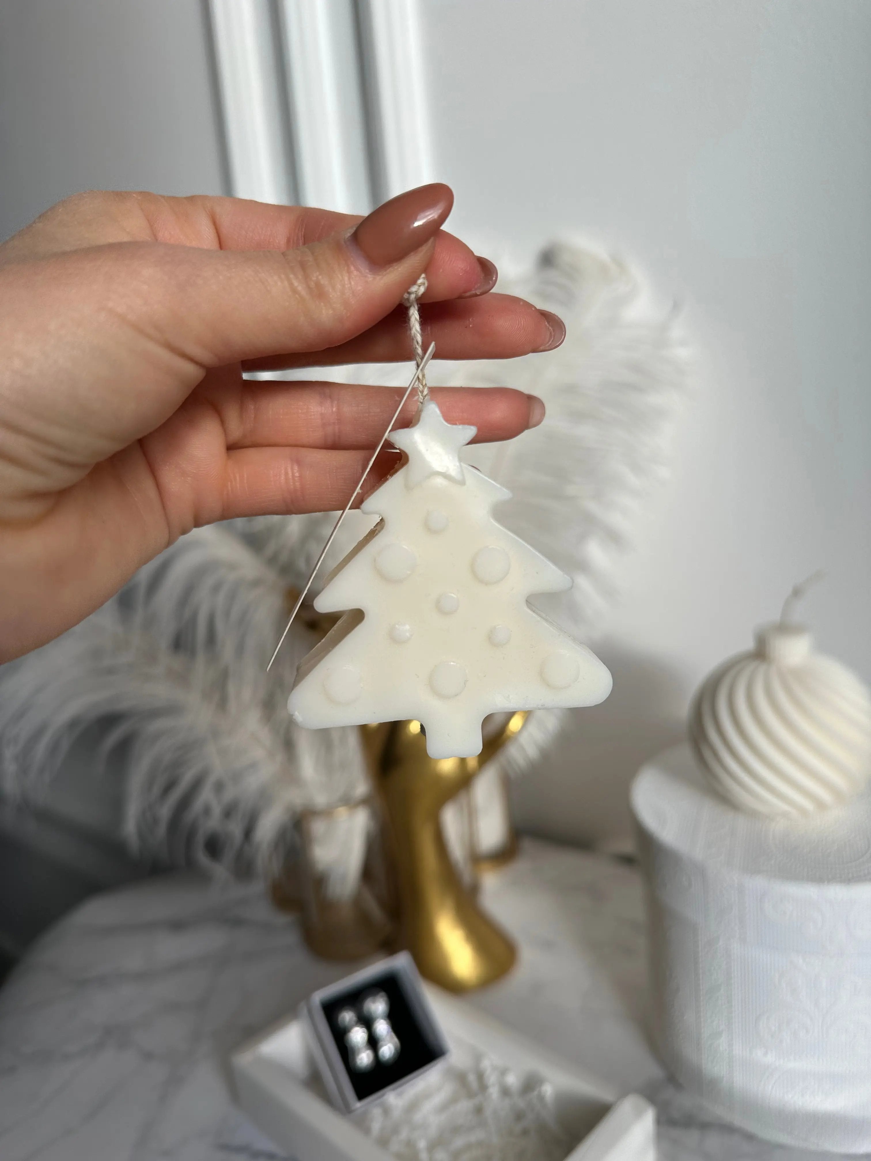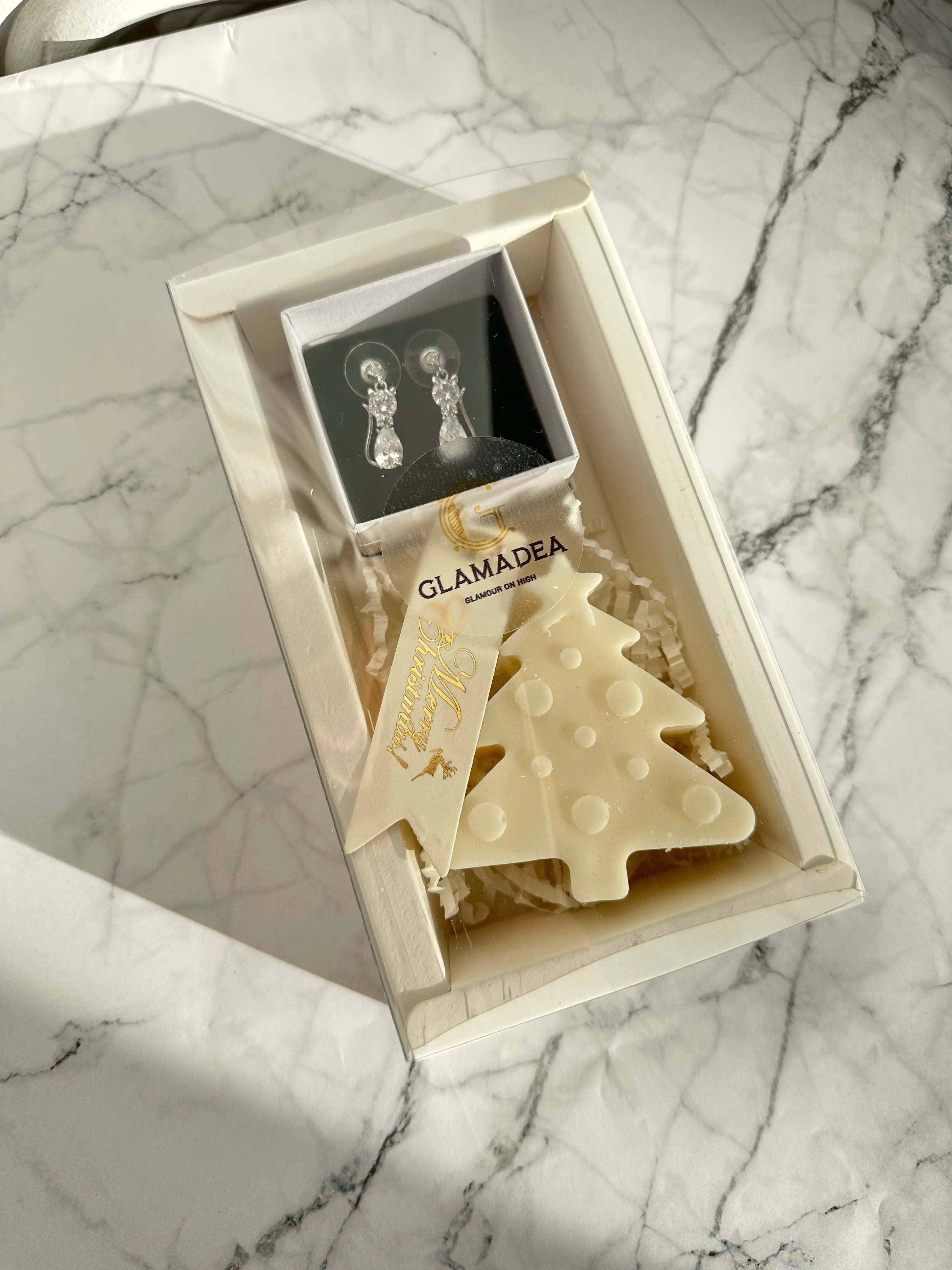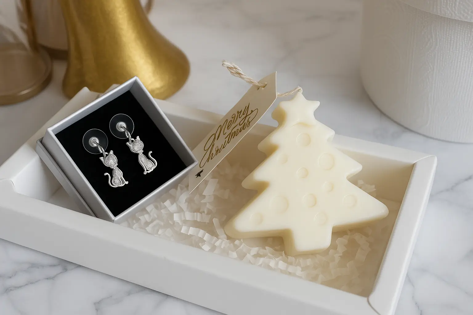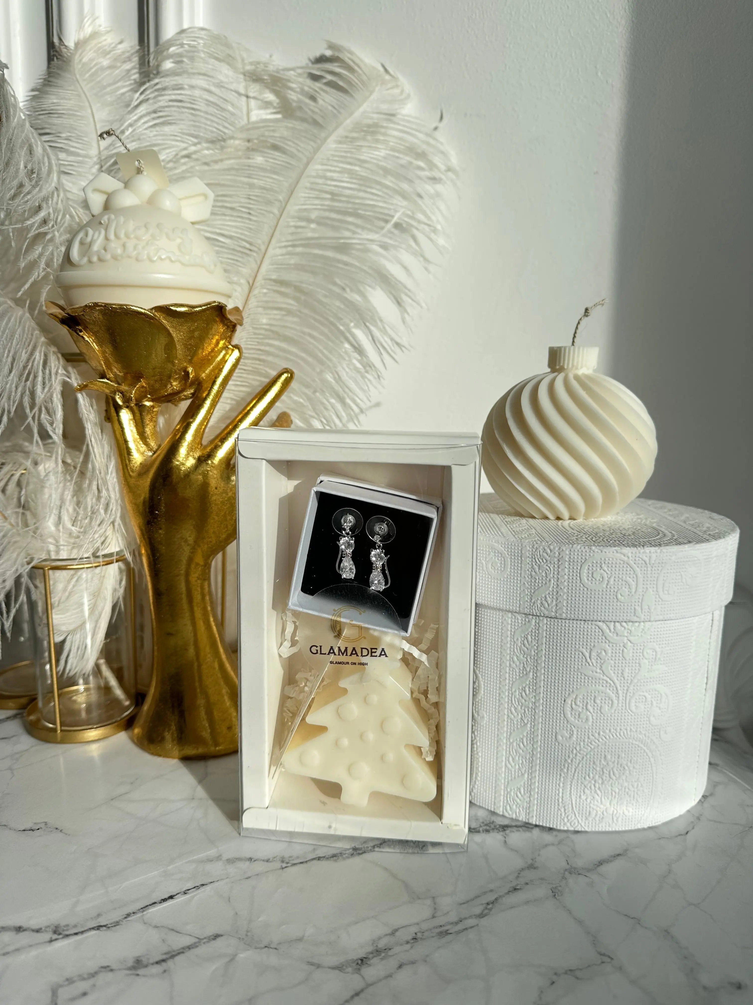 Acest set conține o pereche de cercei placați cu argint, decorați cu pietre zirconiu cubic în formă de pisicuță, simbol al jocului, independenței și energiei feminine, și o lumânare parfumată turnată manual din ceară naturală de soia, în formă de brăduț — un detaliu perfect pentru sezonul de iarnă.