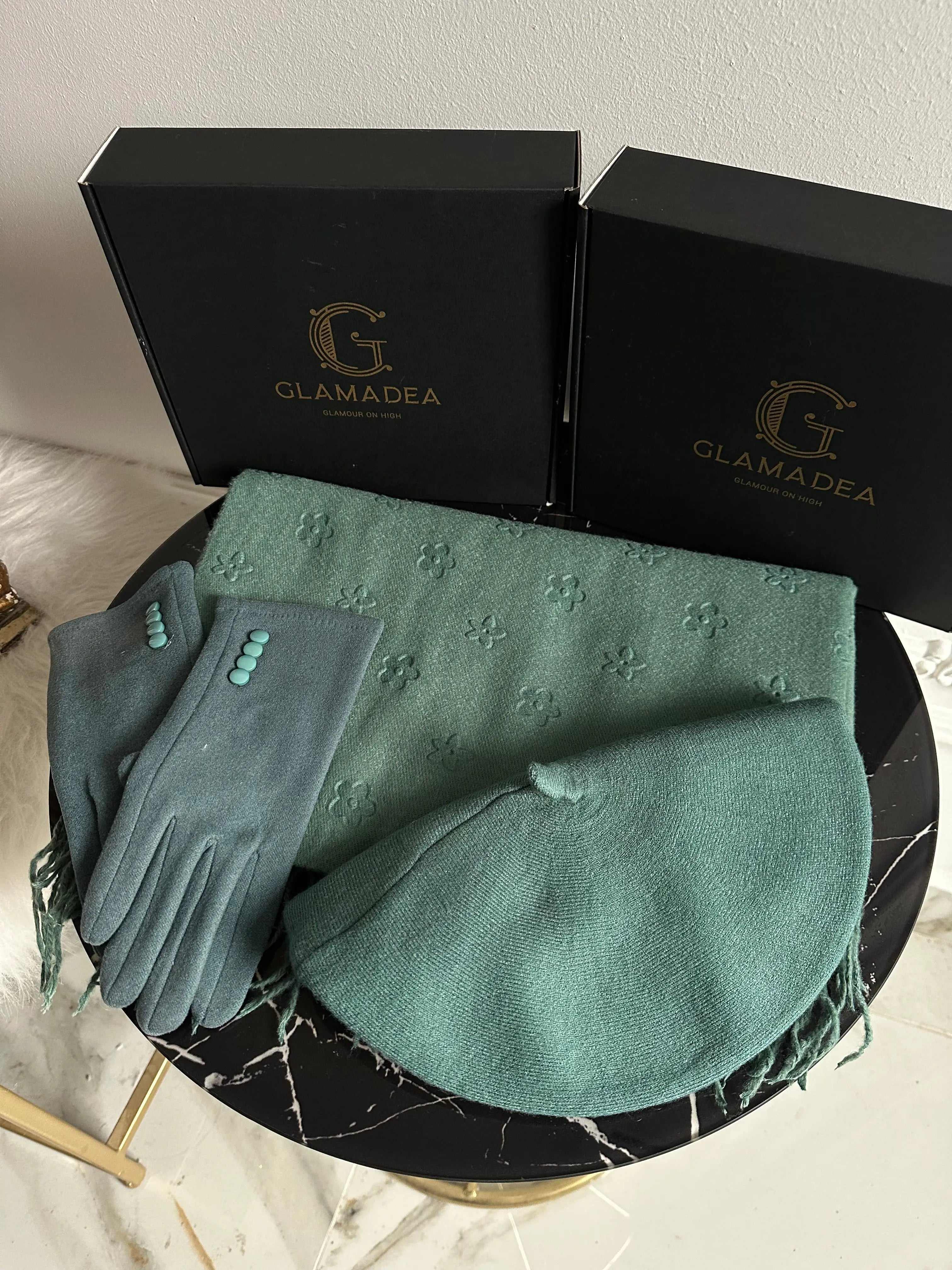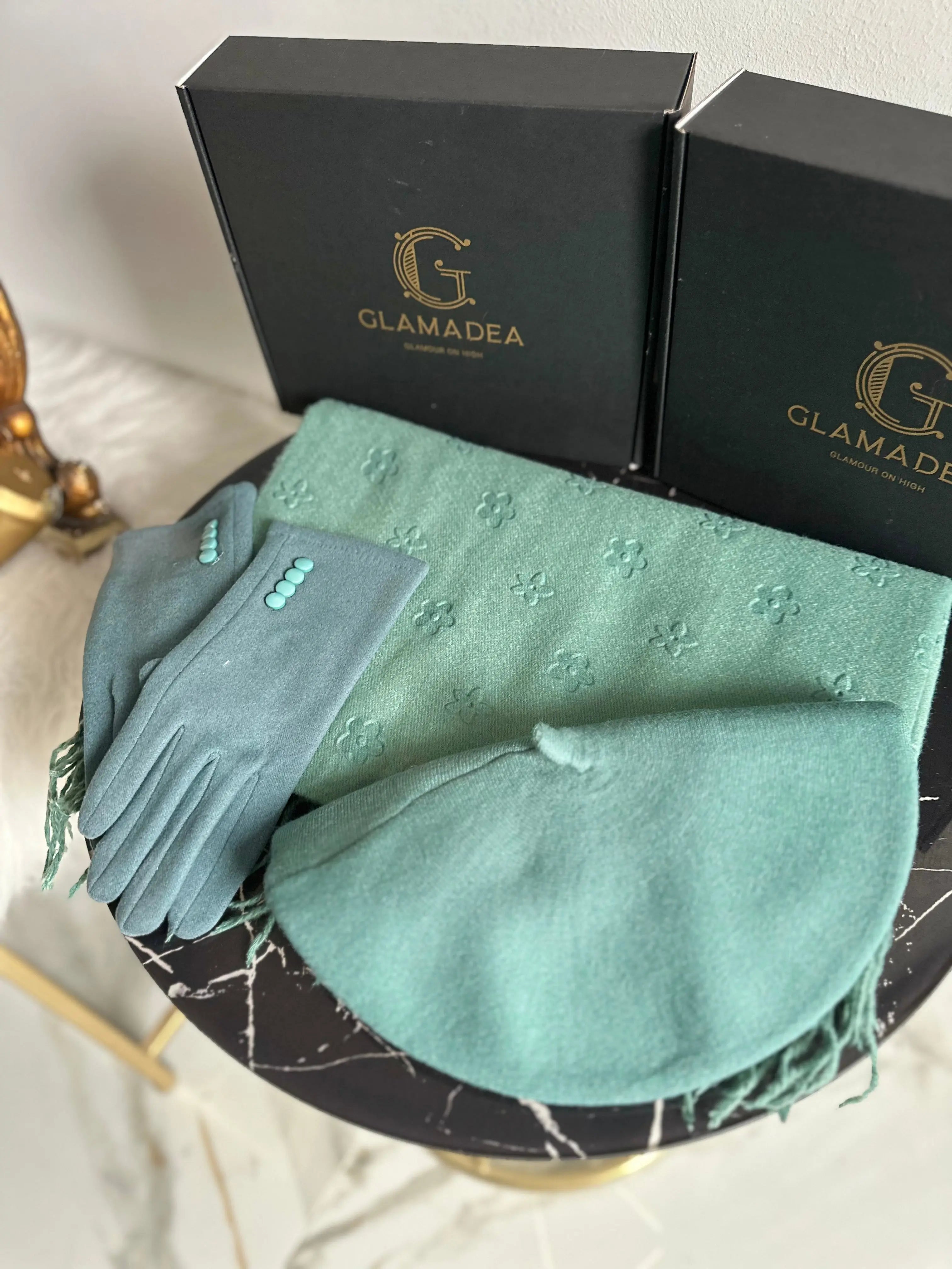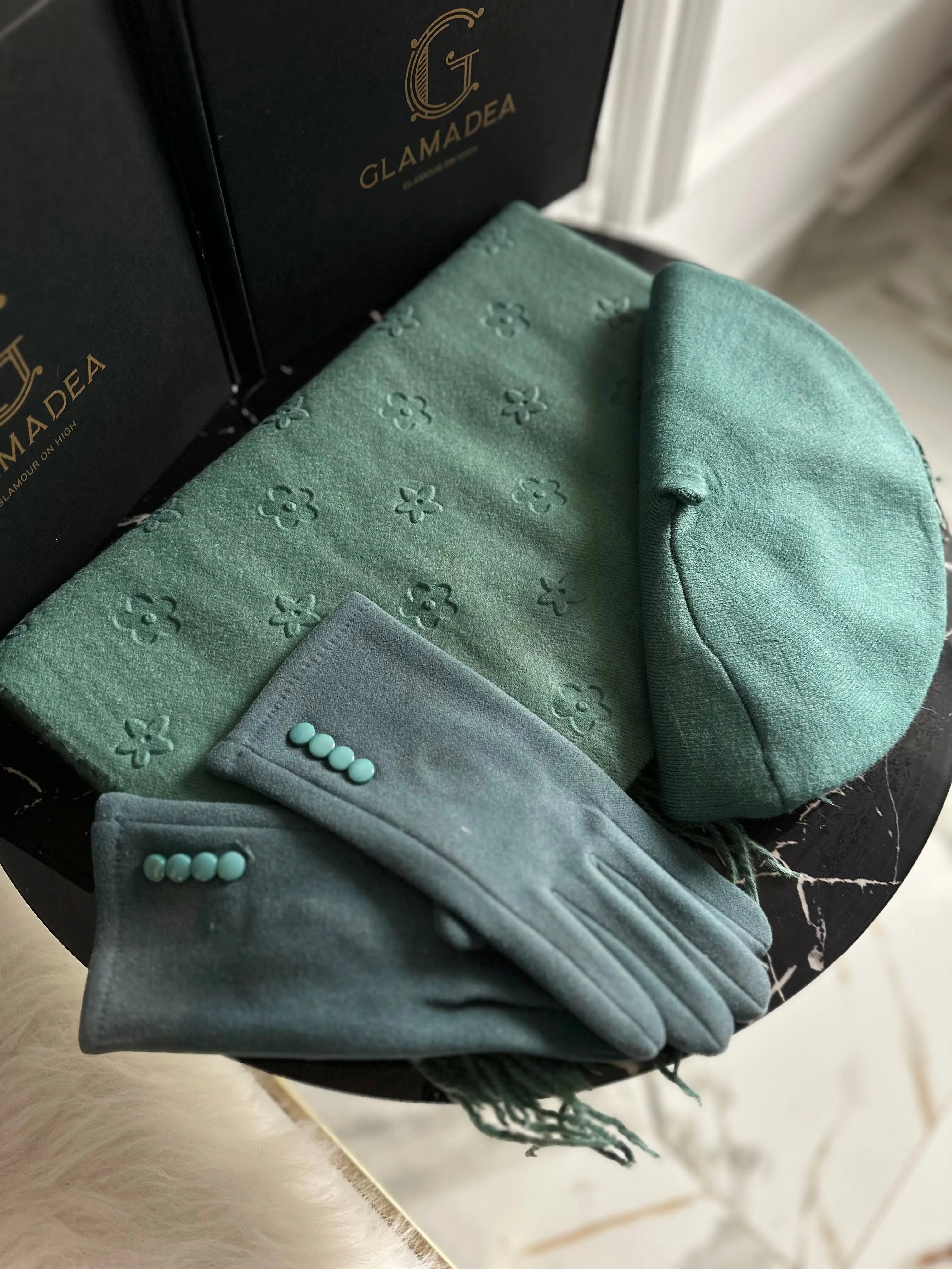 Set cadou Craciun turcoaz cu esarfa cashmere cu aplicatii 3D, manusi fleece calduroase si bereta 100% bumbac