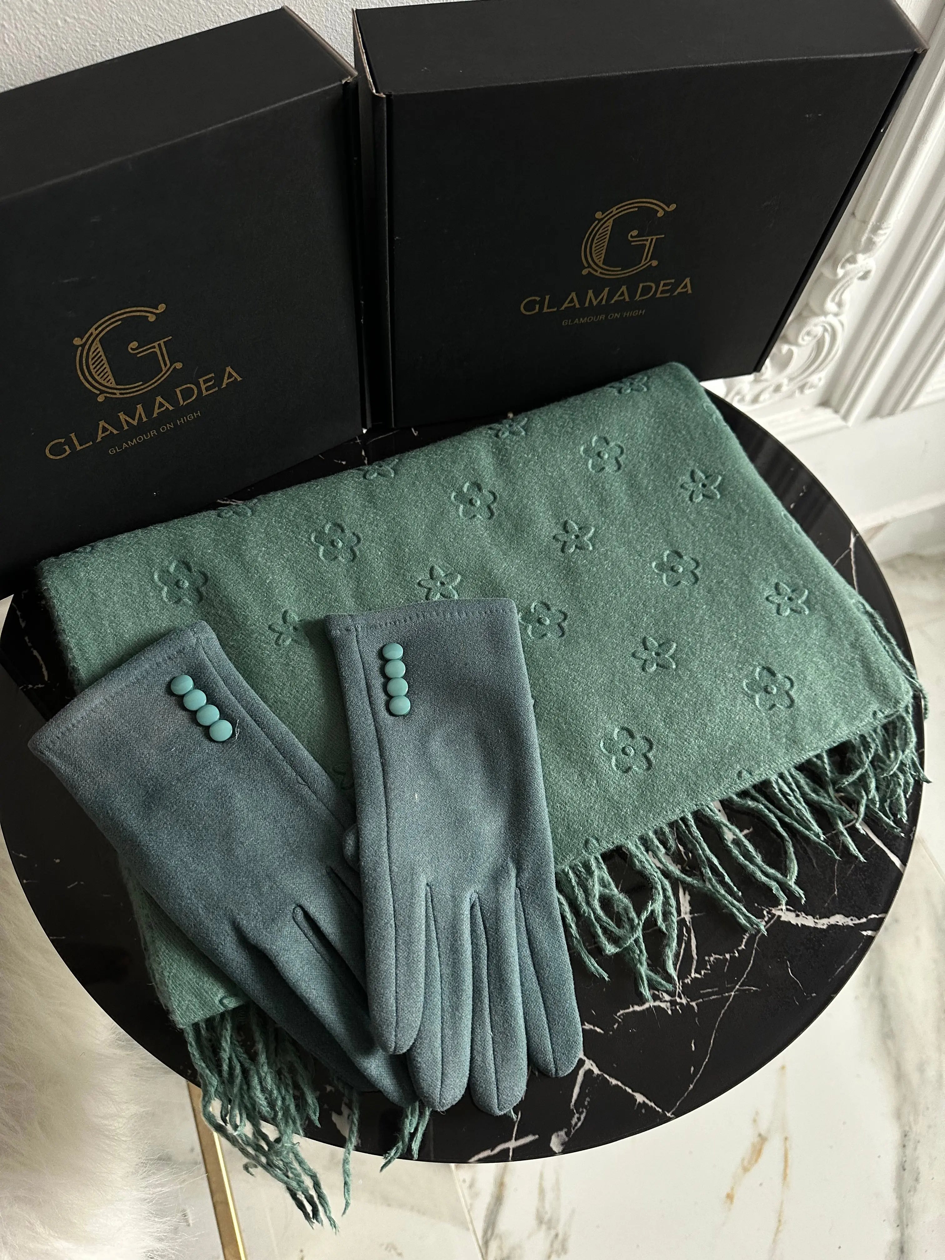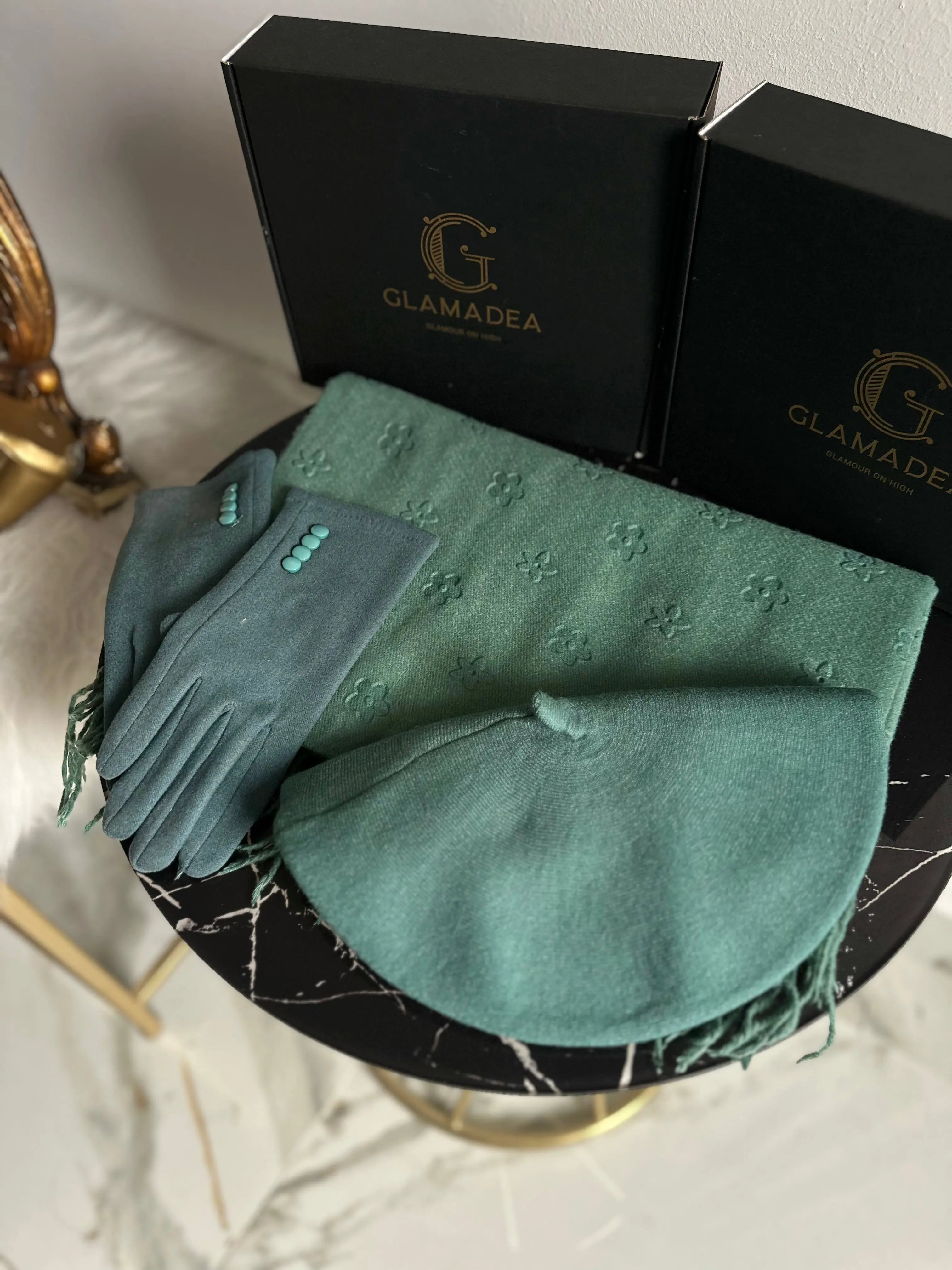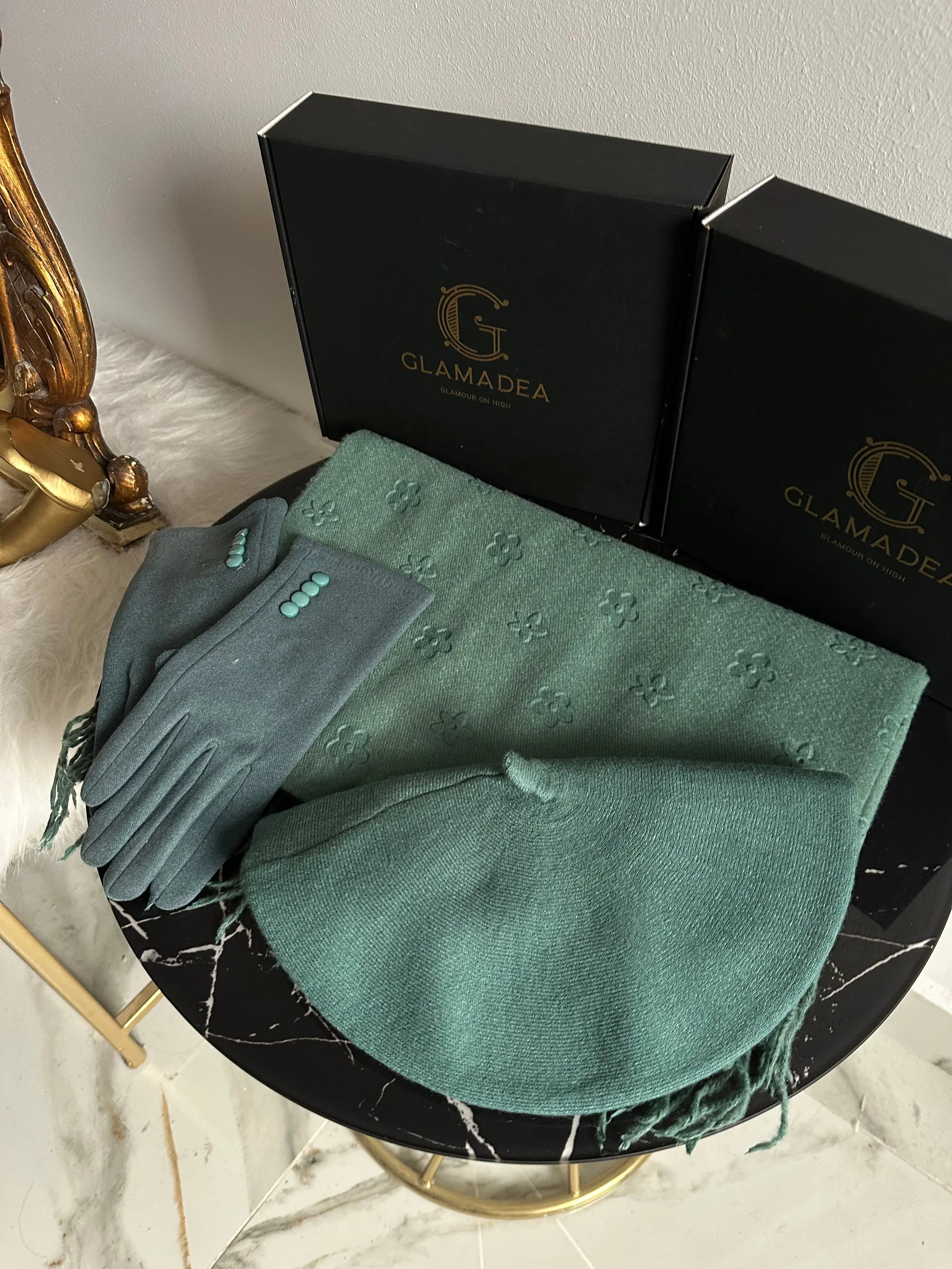Set cadou Craciun turcoaz cu esarfa cashmere cu aplicatii 3D, manusi fleece calduroase si bereta 100% bumbac