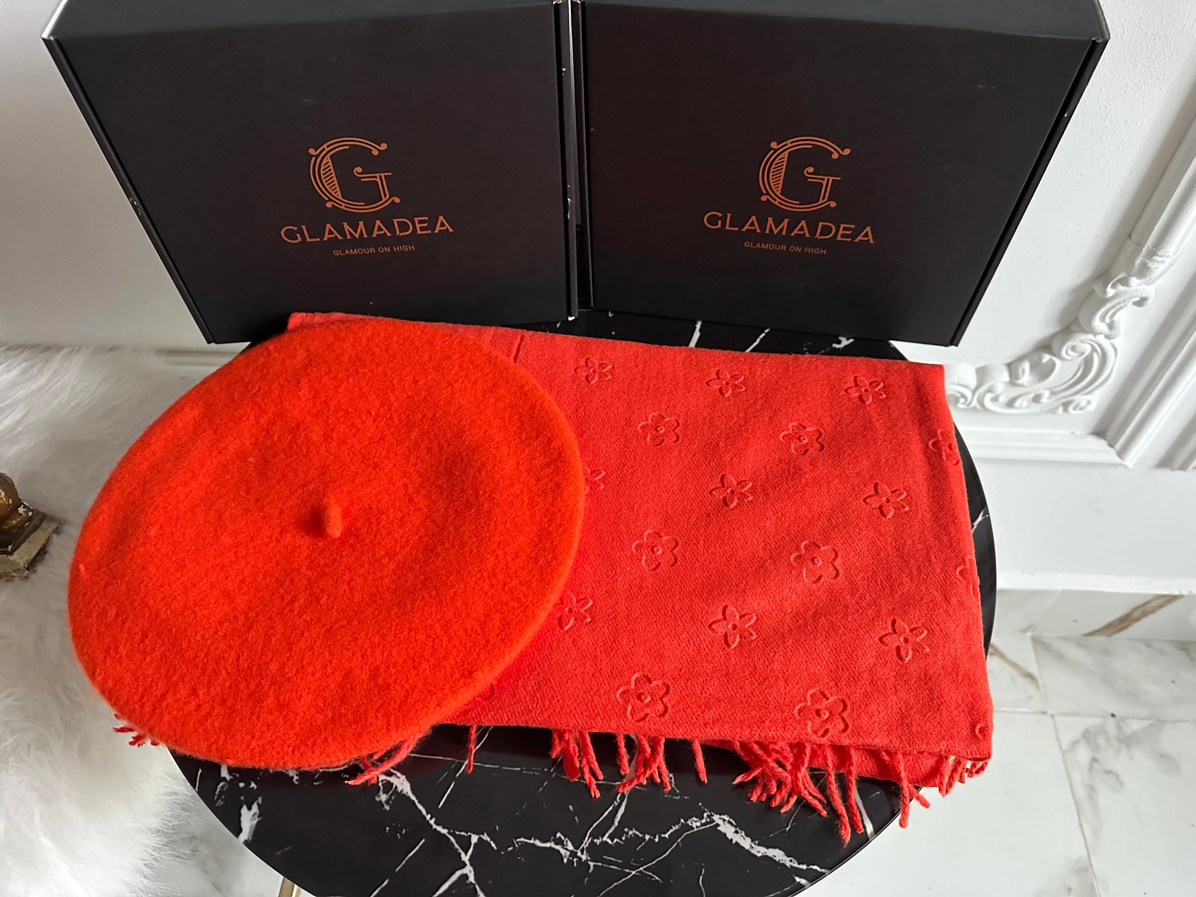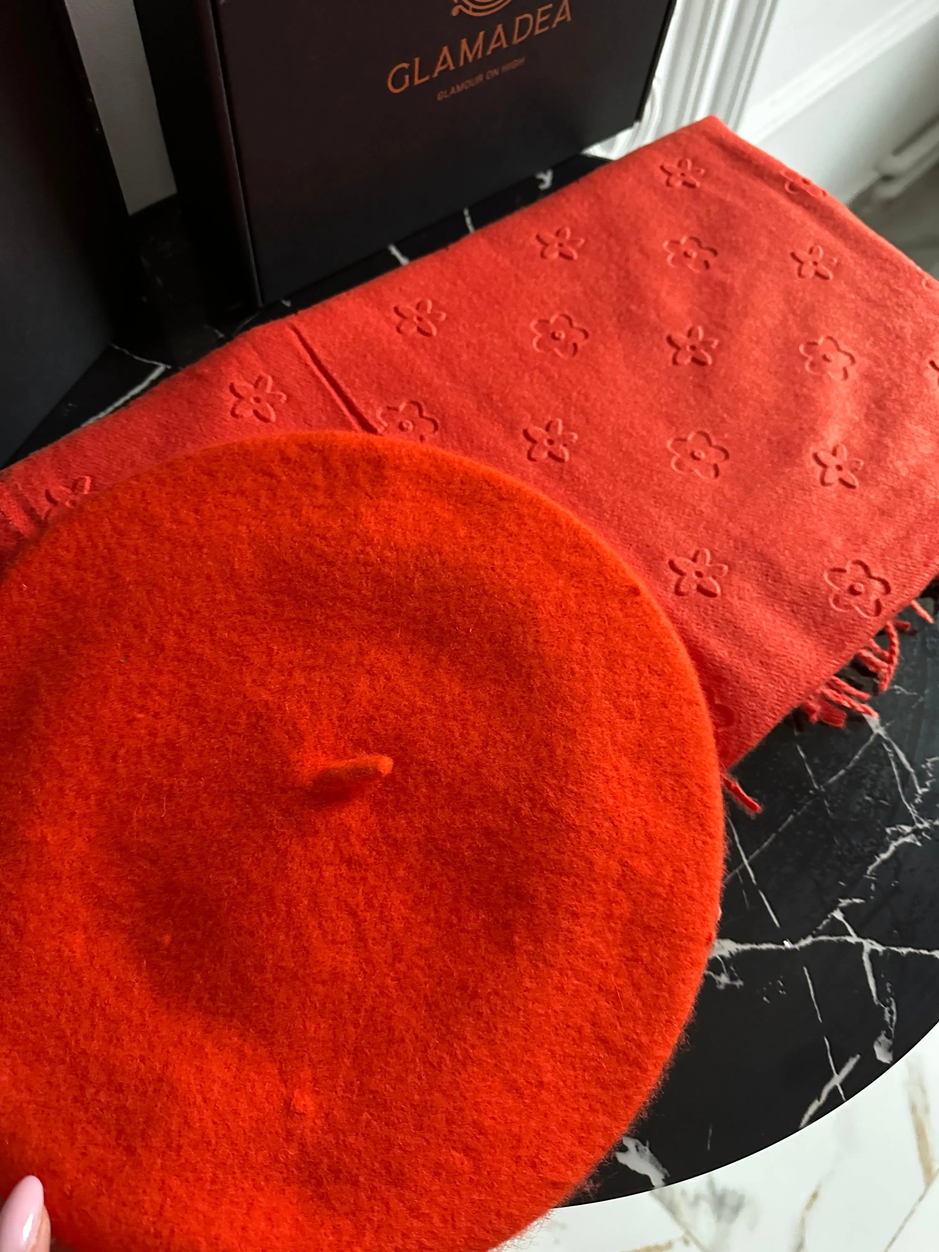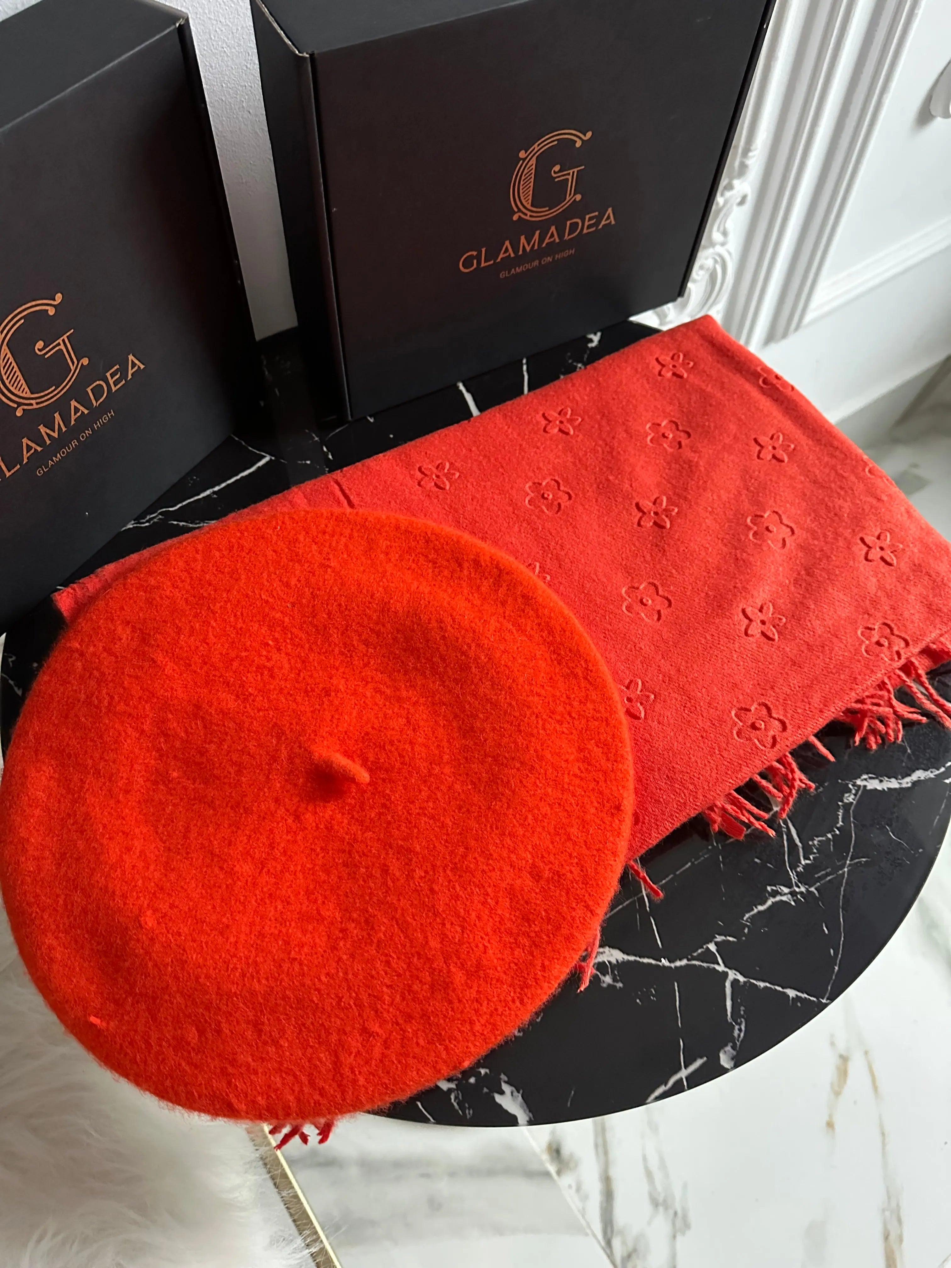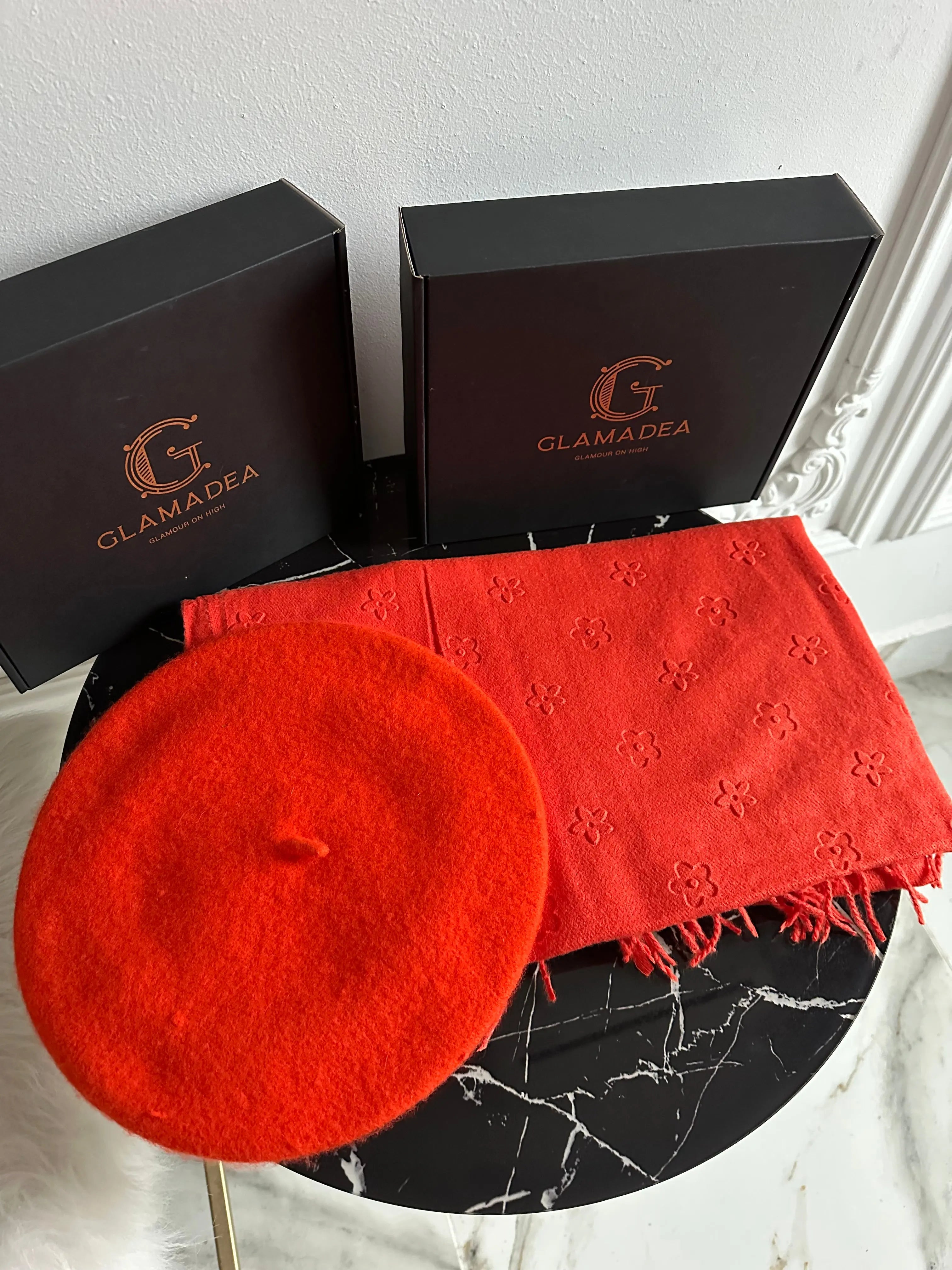 Set cadou esarfa cashmere cu imprimeu relief floral si bereta lana prelucrata – rosu coral