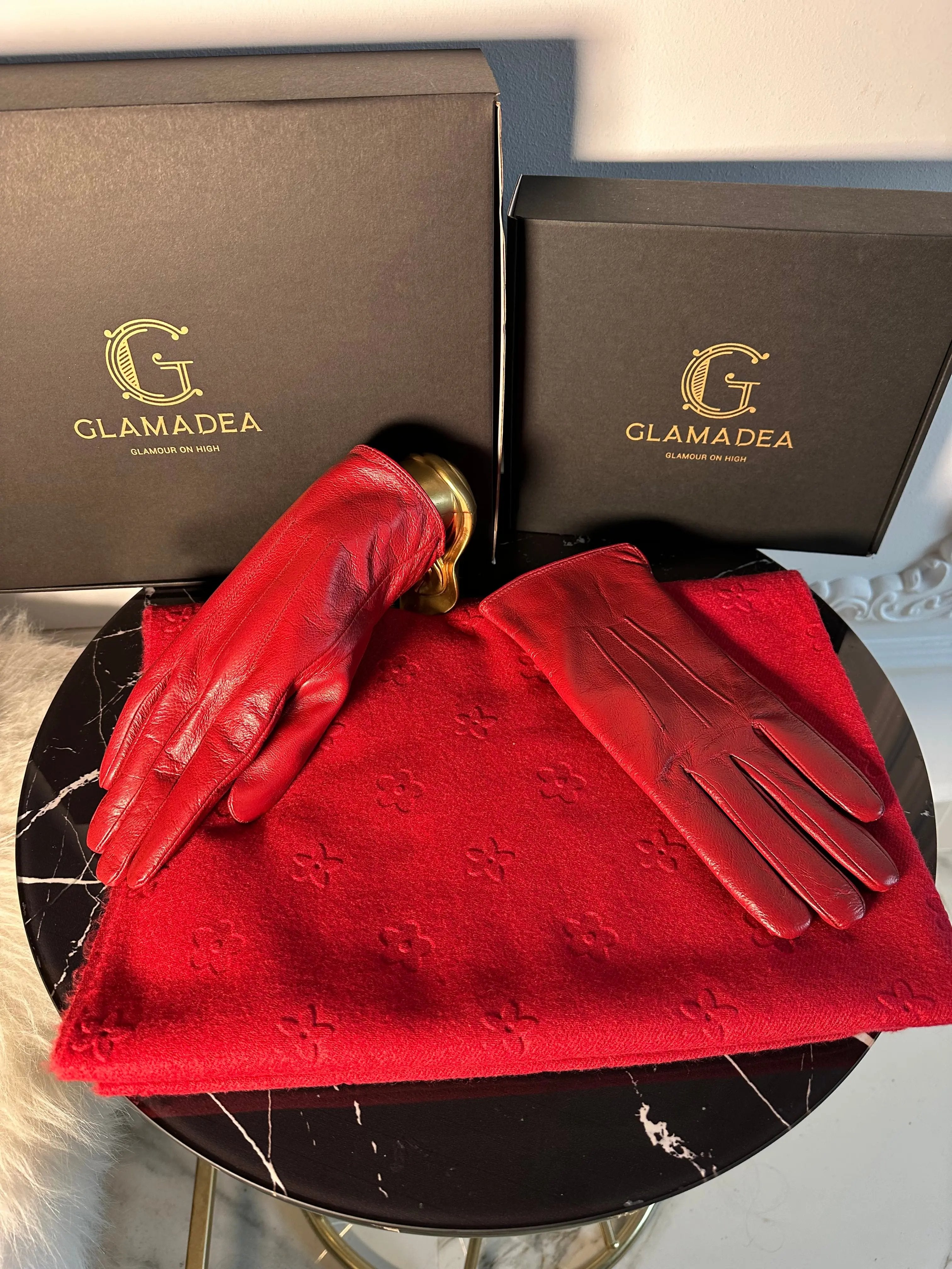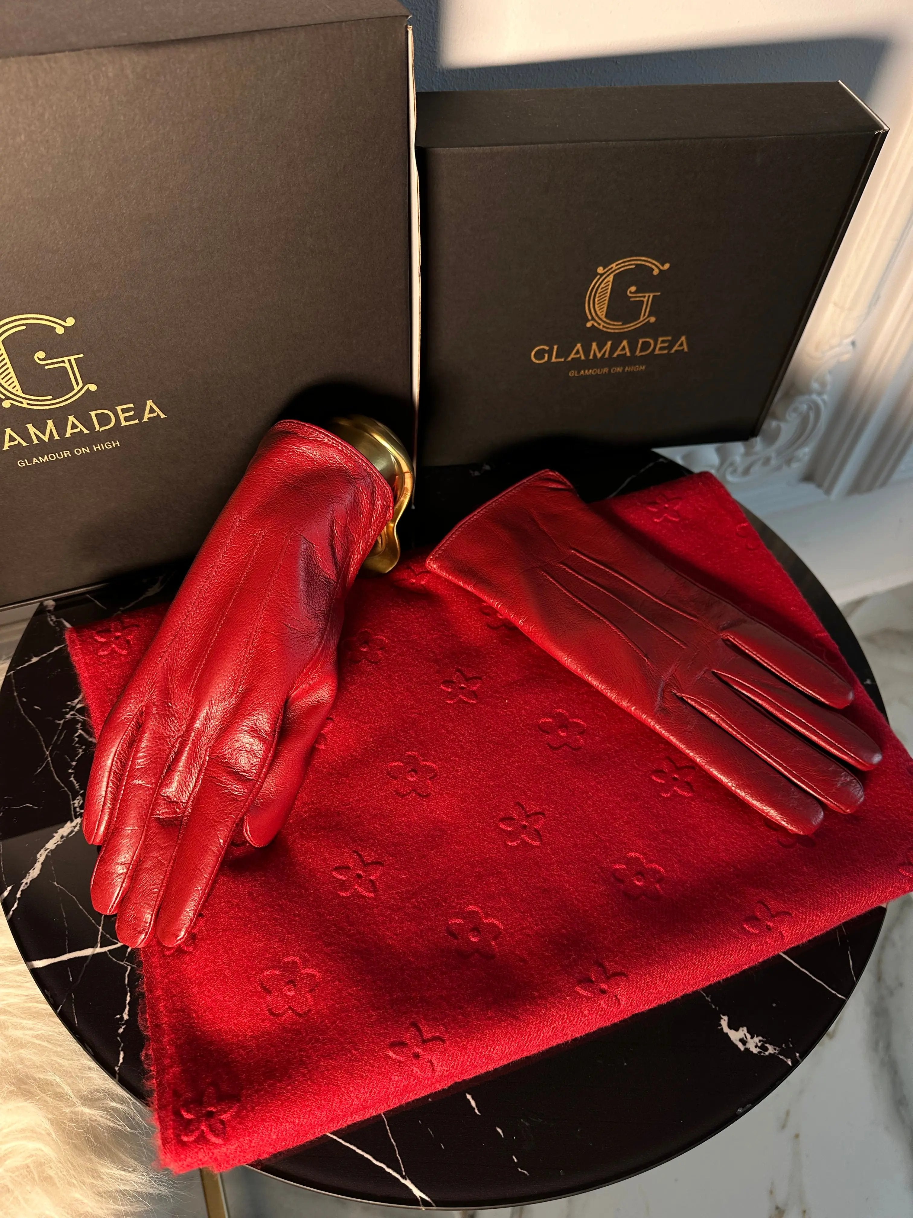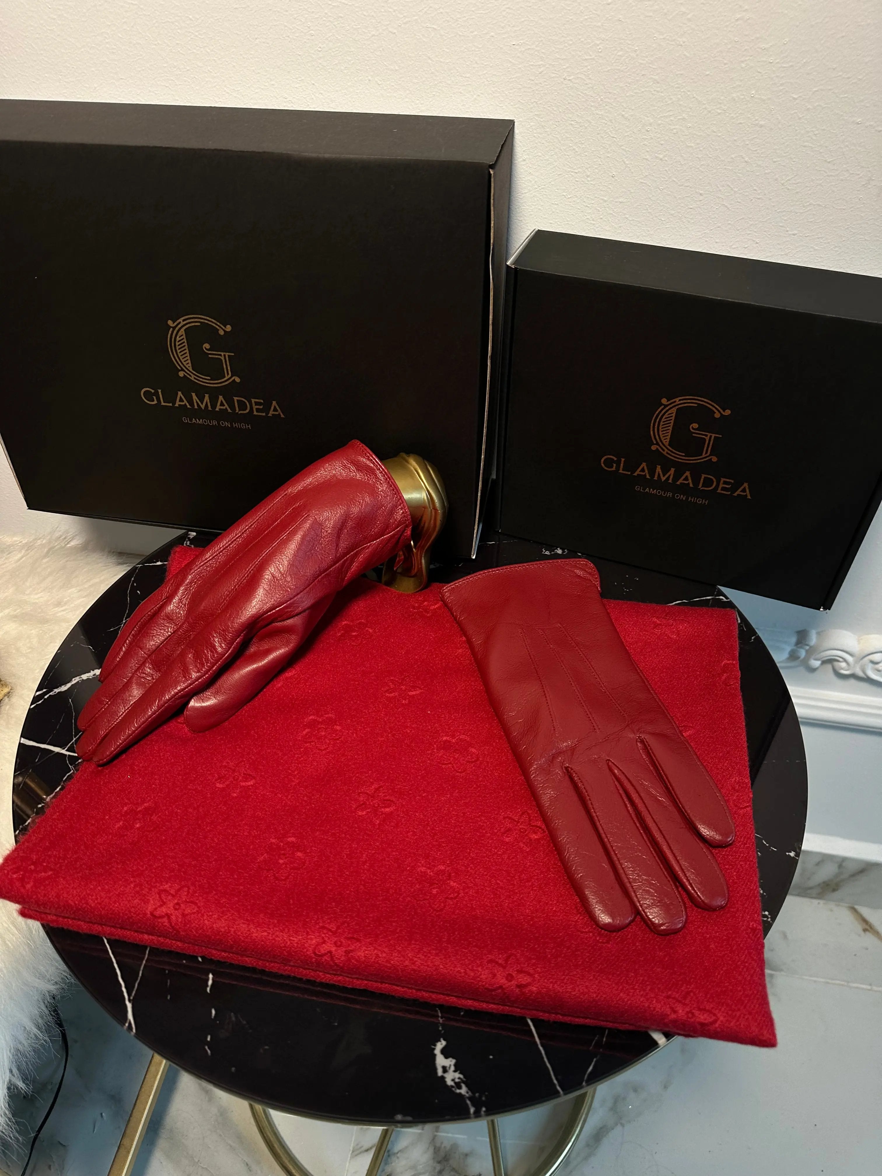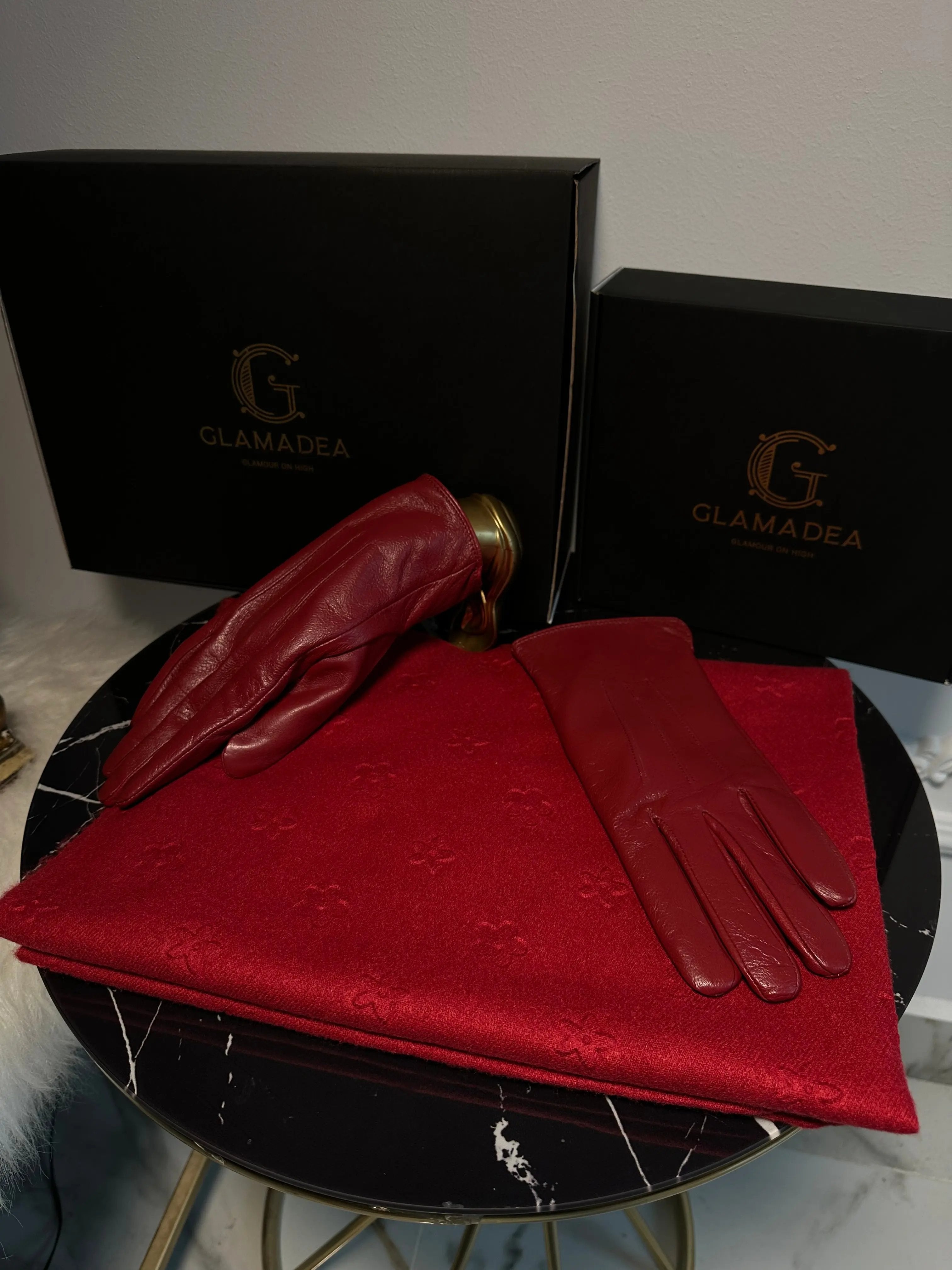 Set Esarfa Cashmere si Manusi Piele Naturala Red Burgundy, Flori 3D, Cadou Elegant Femei