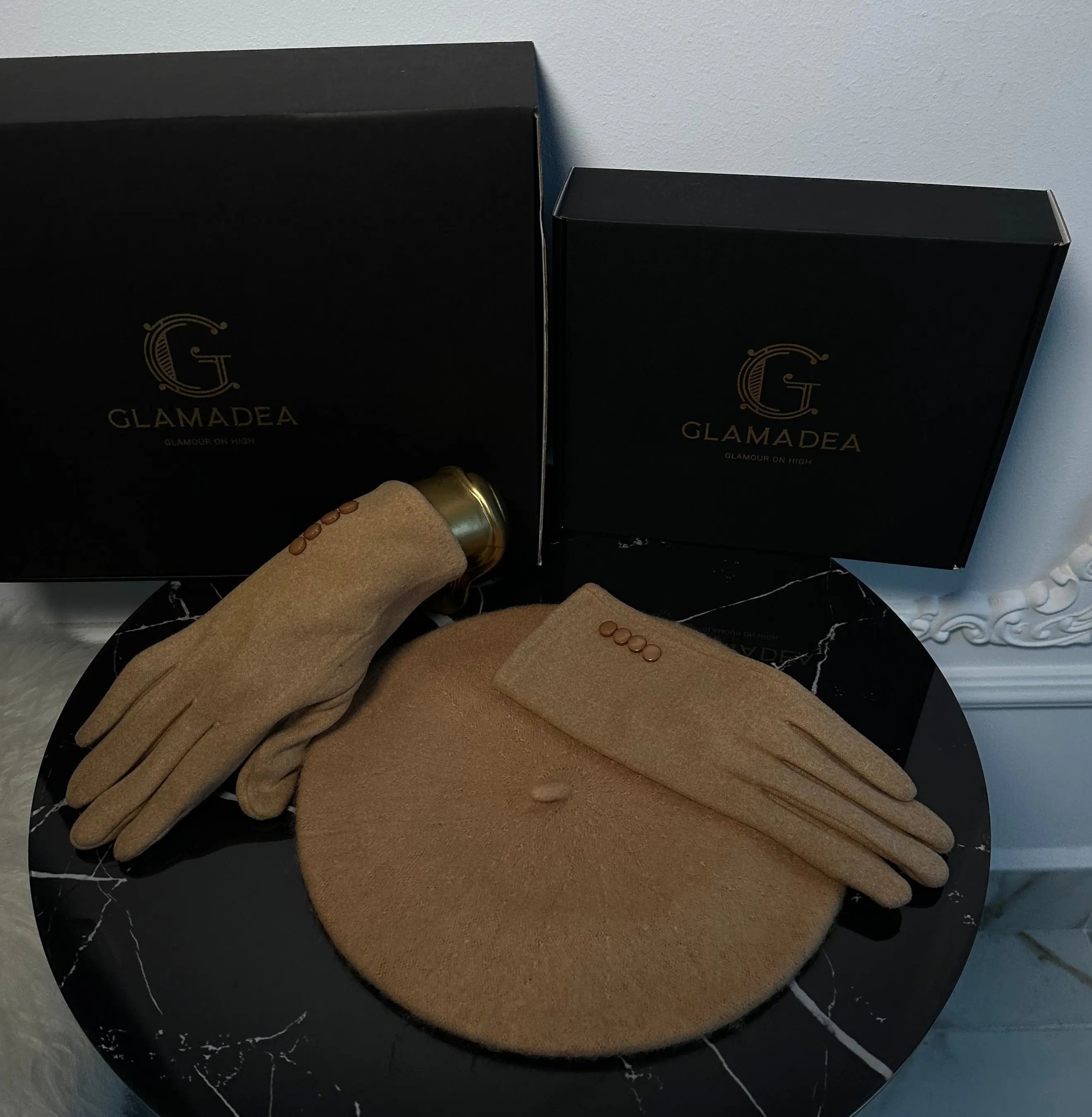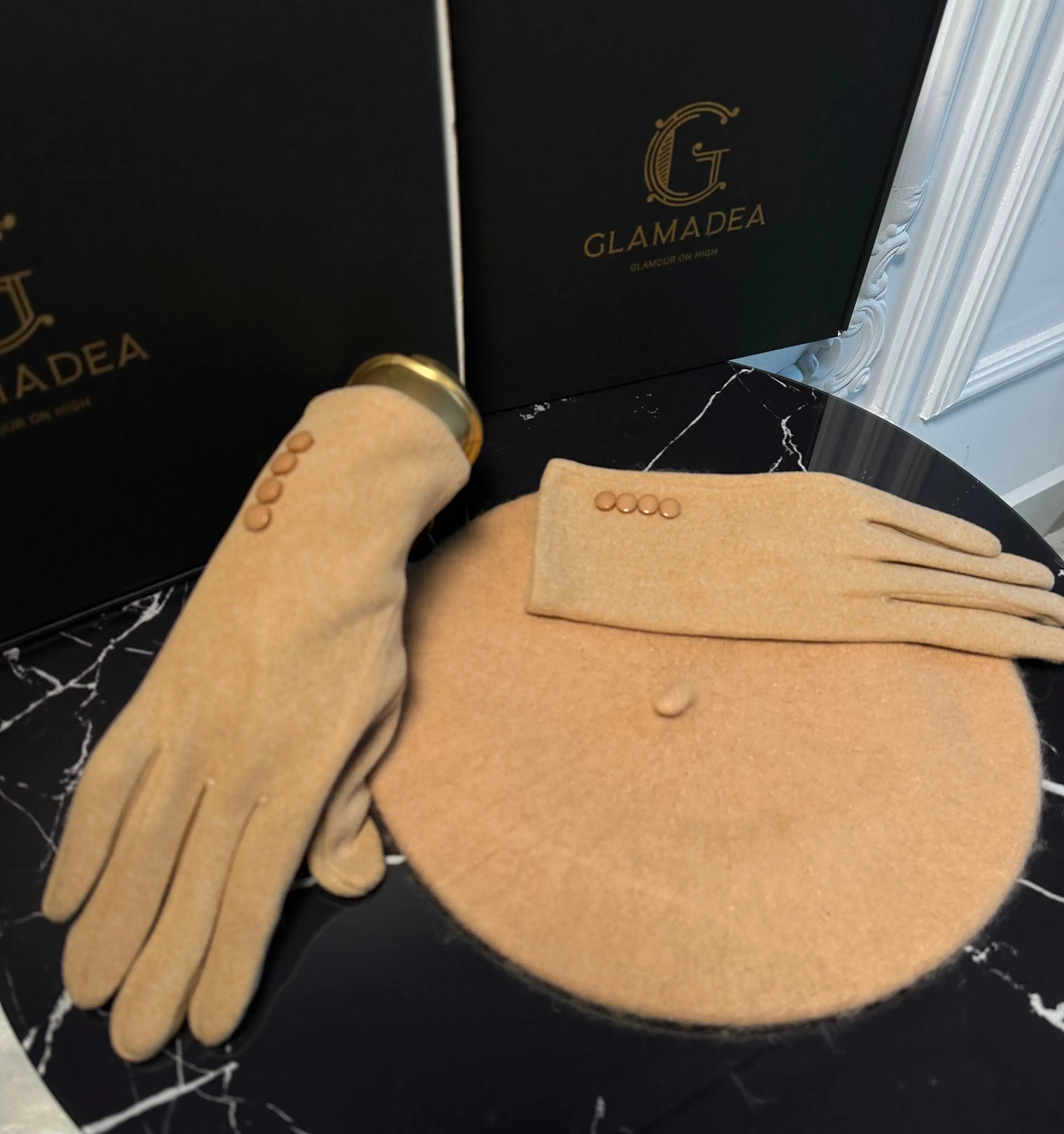 Set beretă și mănuși din lână premium – culoare nude