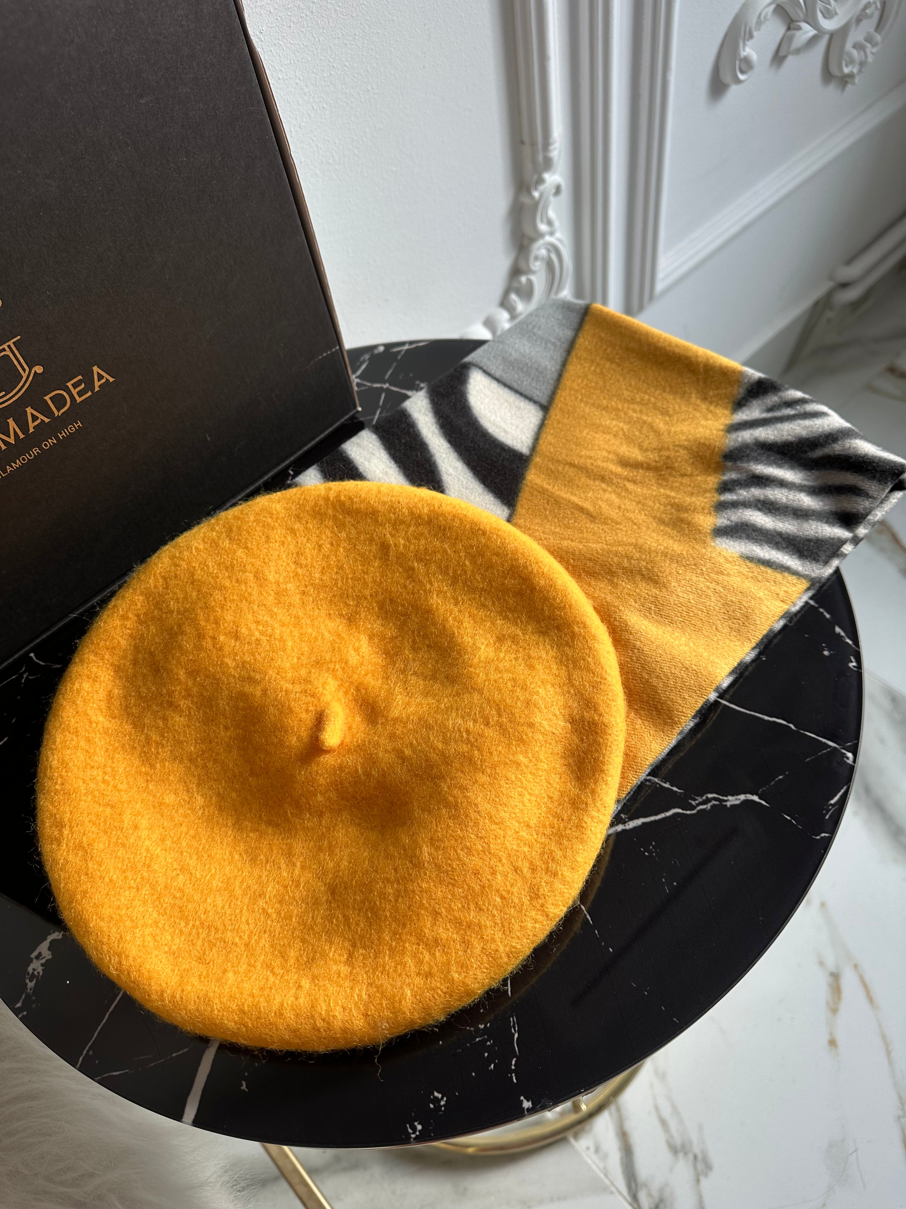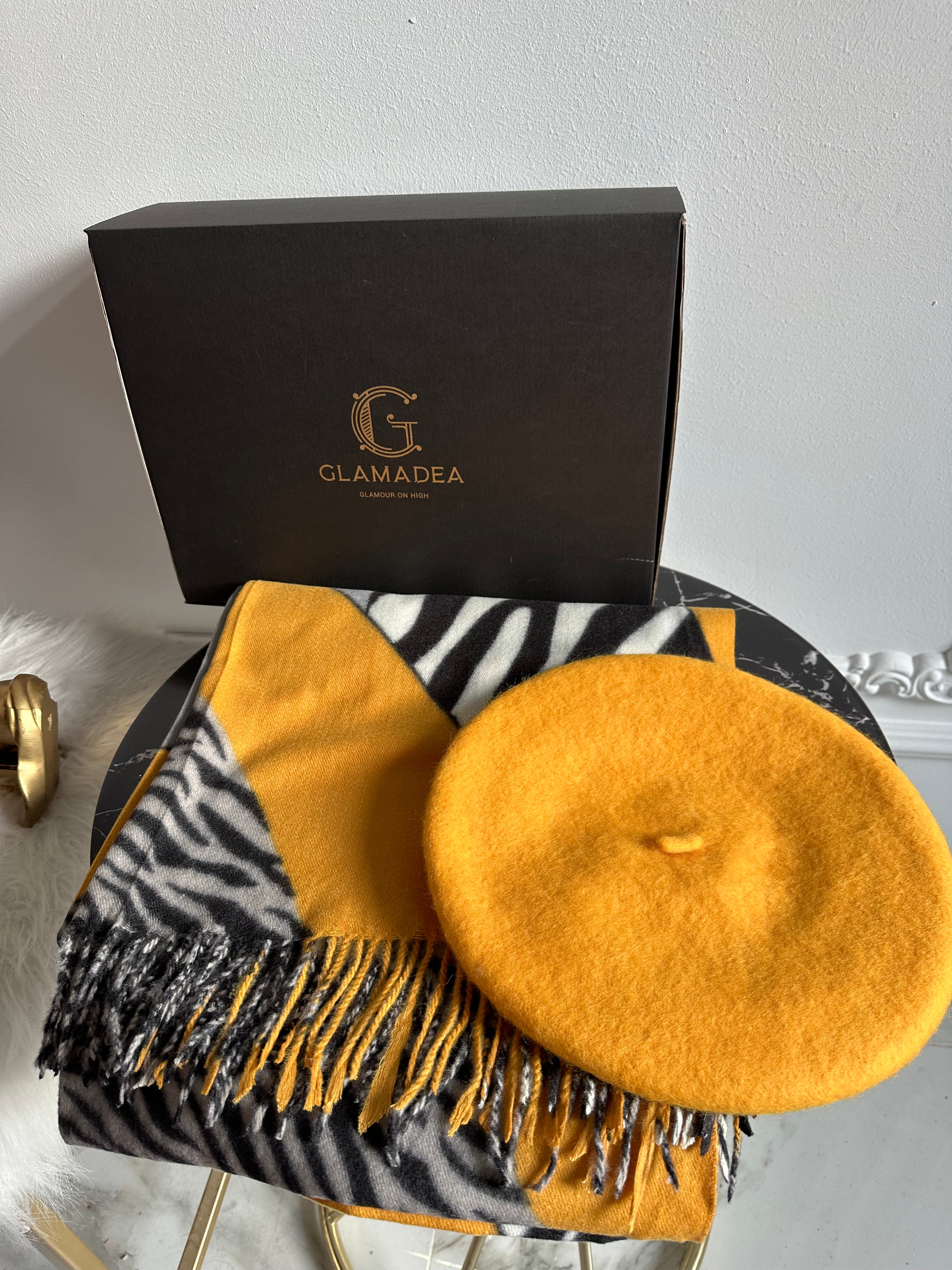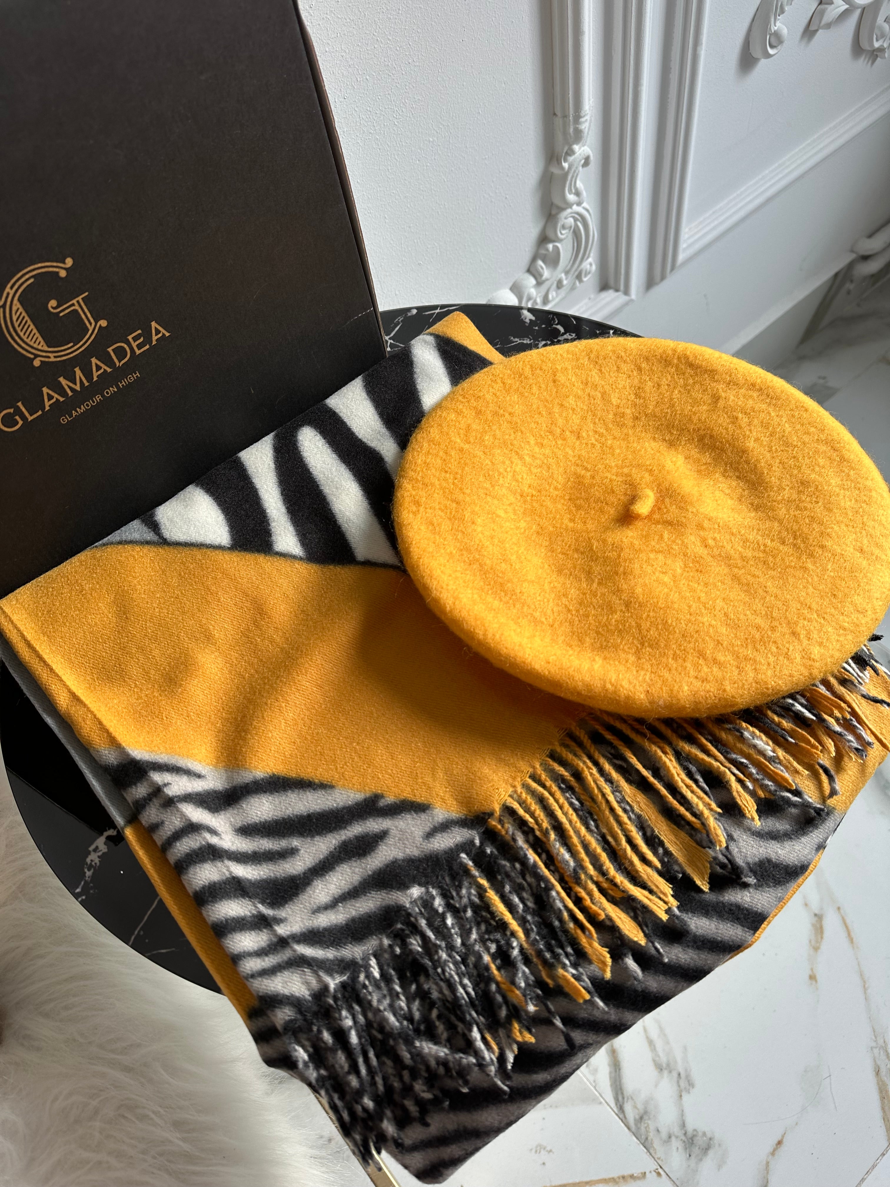 Set cadou esarfa animal print galben cu detalii zebra din cashmere–bumbac–vascoza si bereta din lana 100%