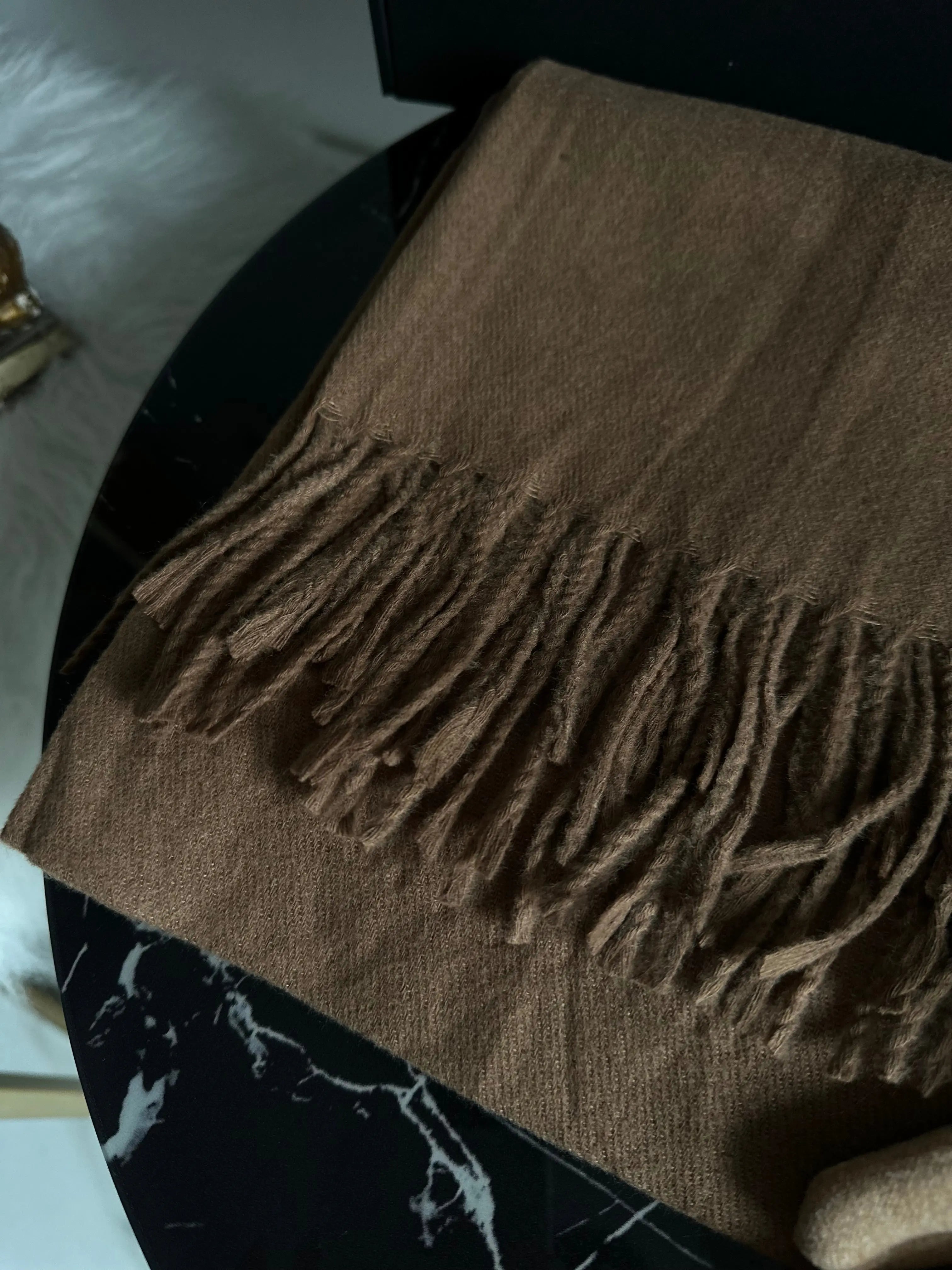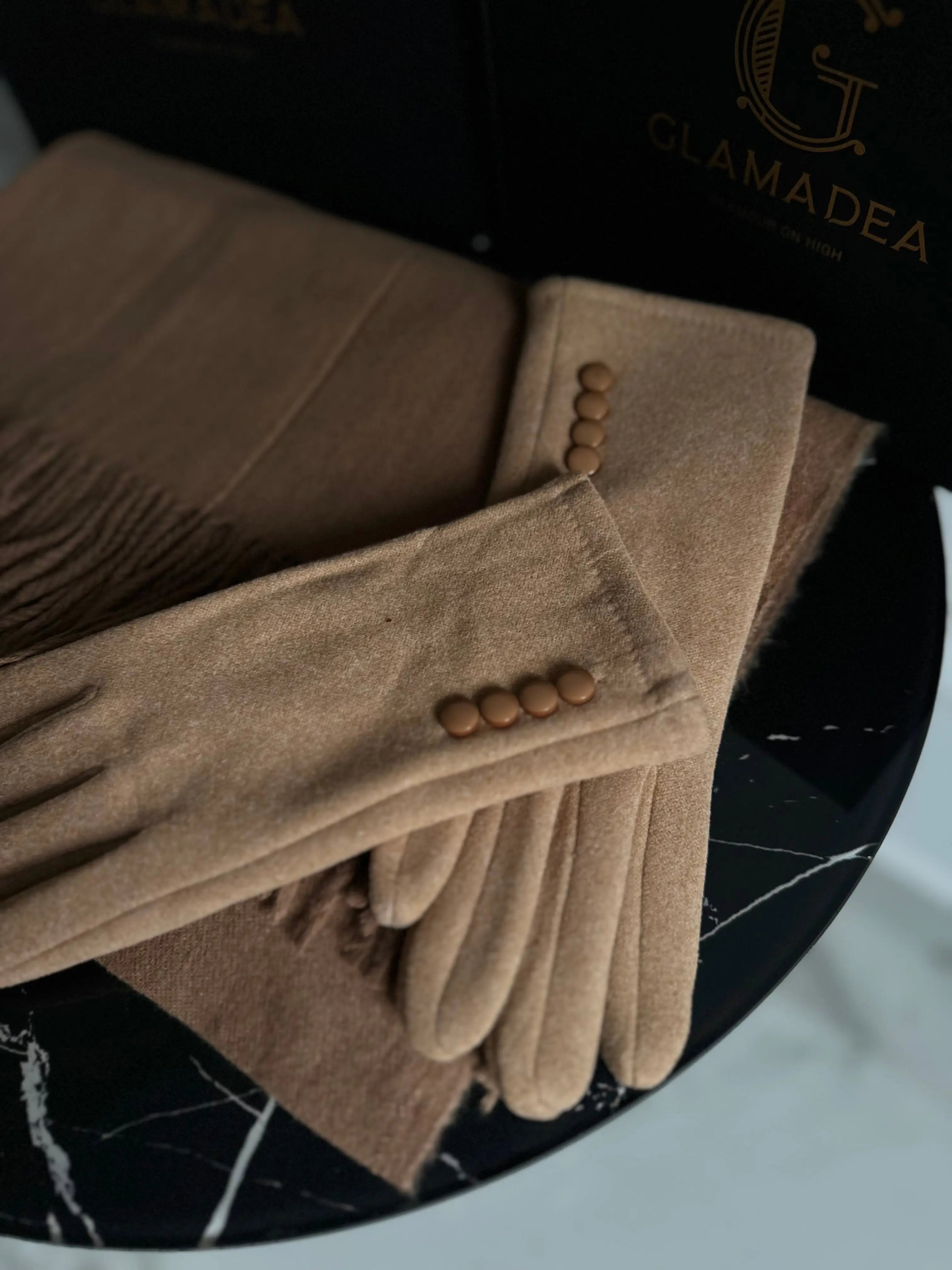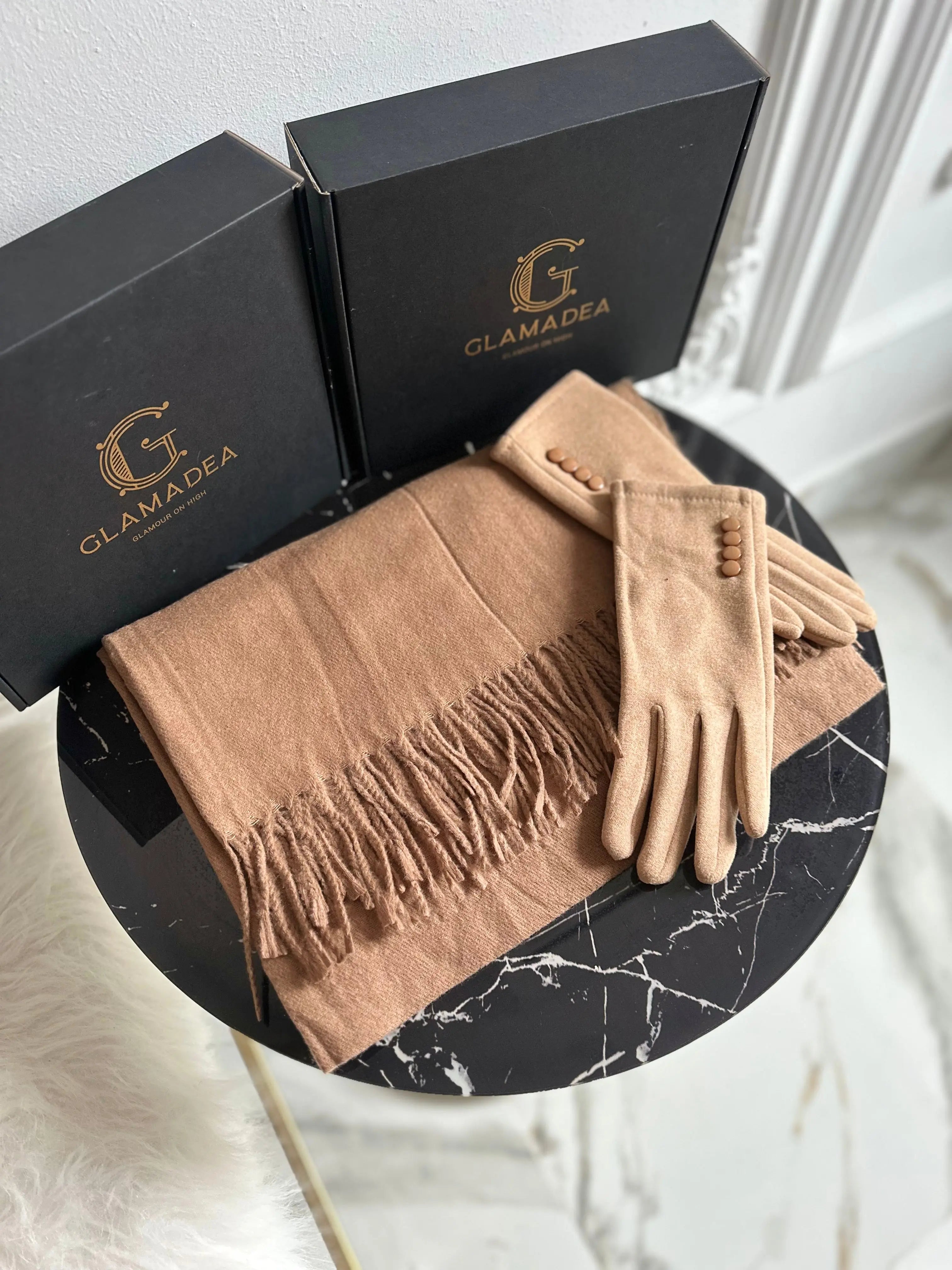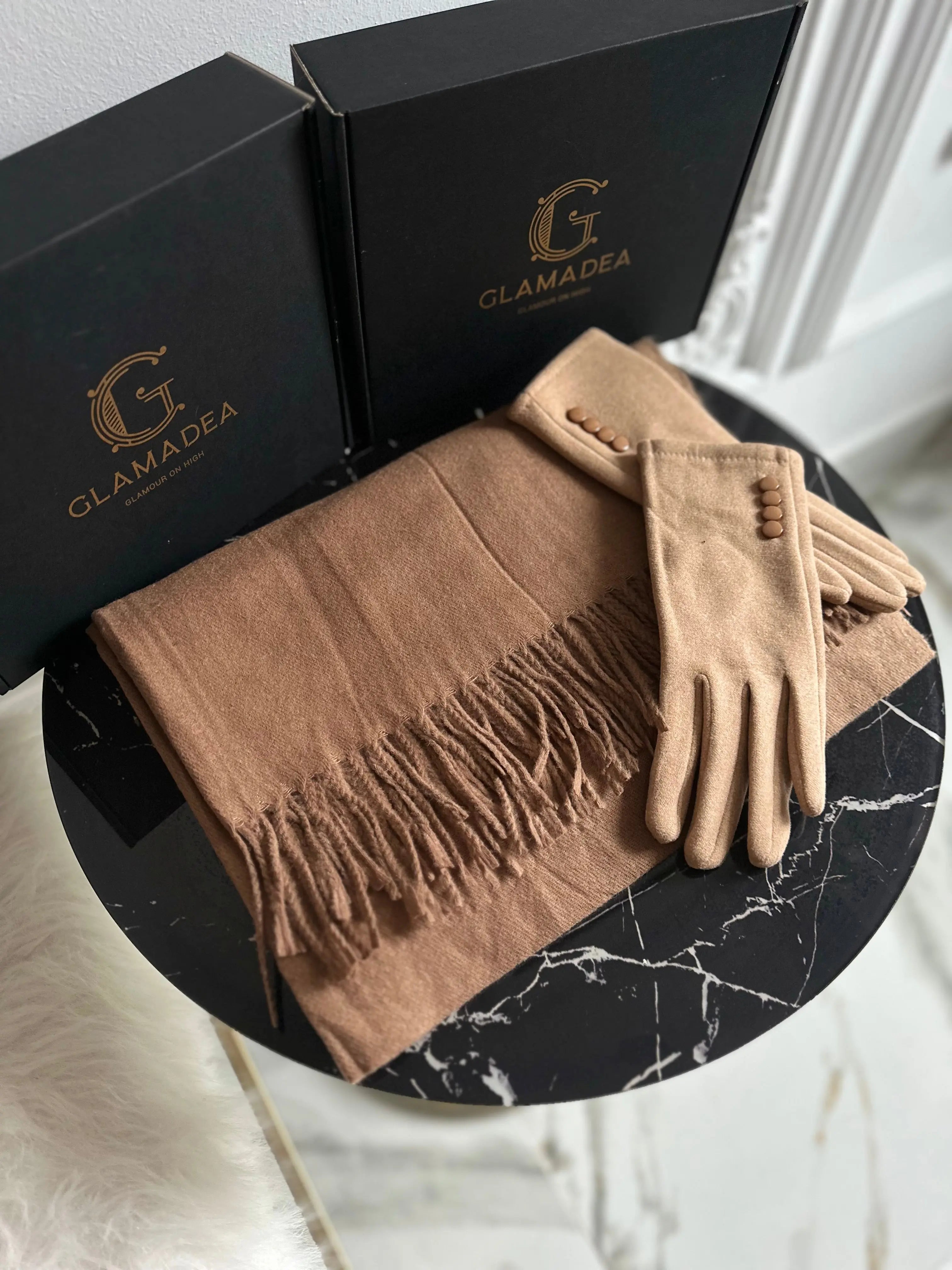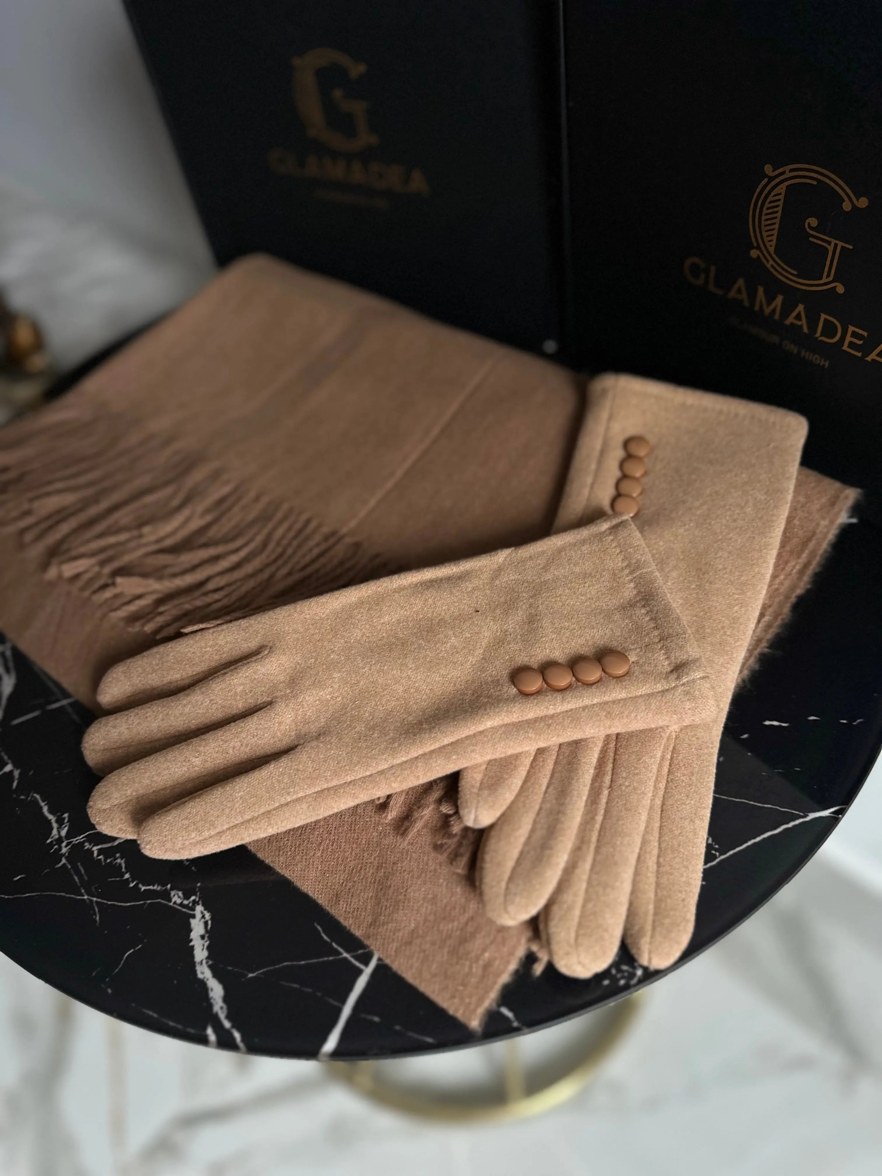 Set cadou esarfa maro cashmere, vascoza si lana cu manusi nude calduroase cu nasturi decorativi