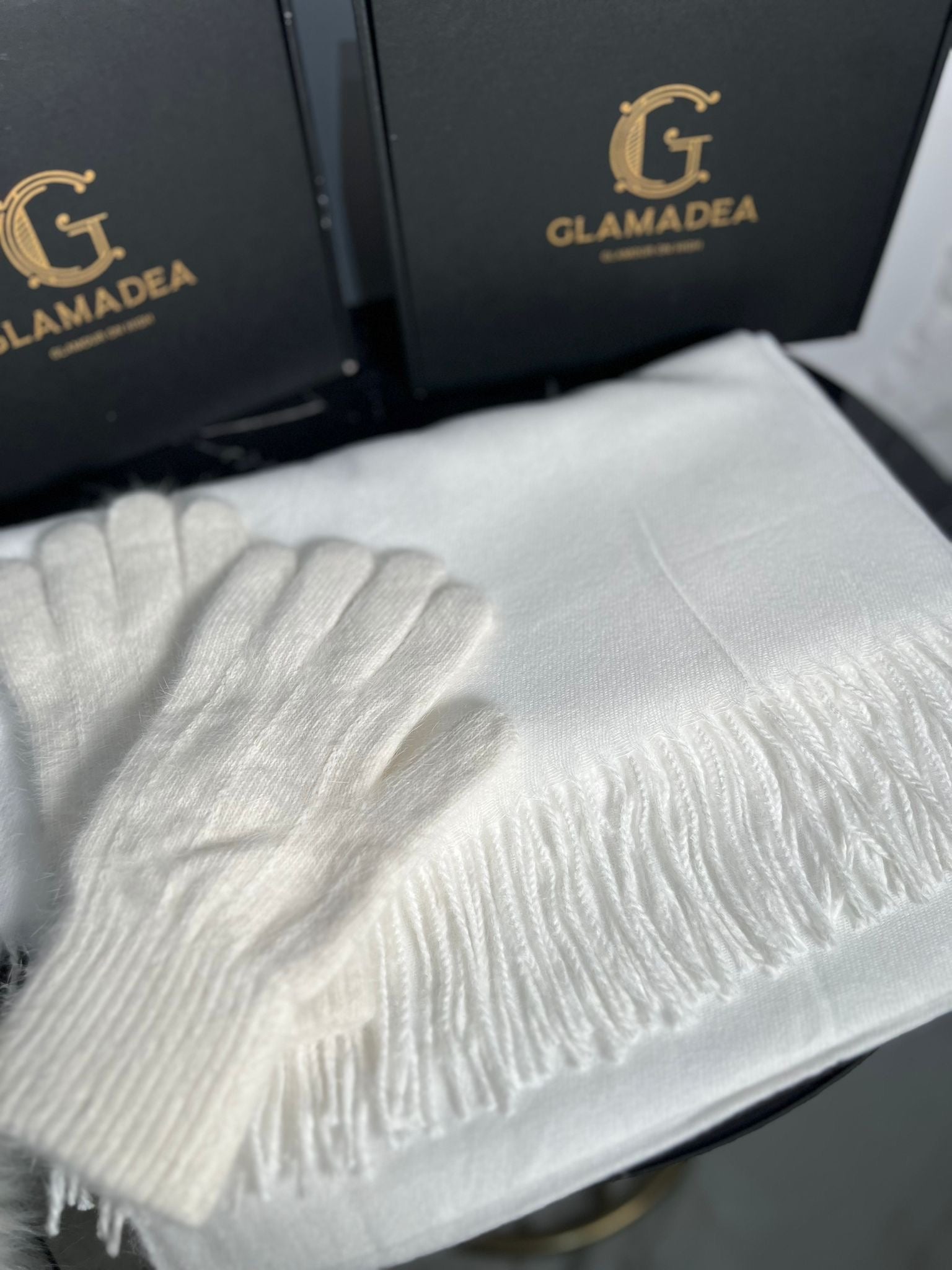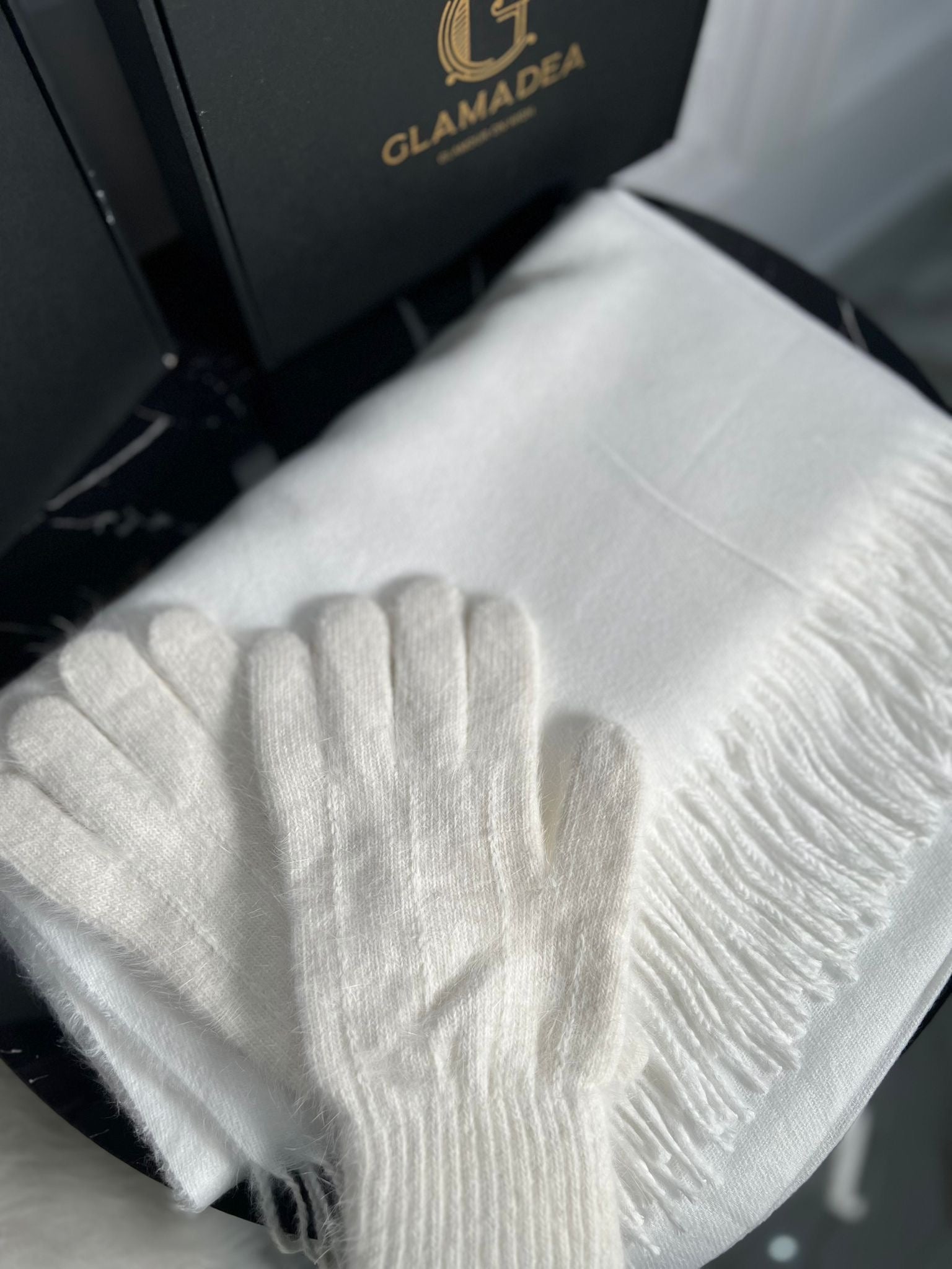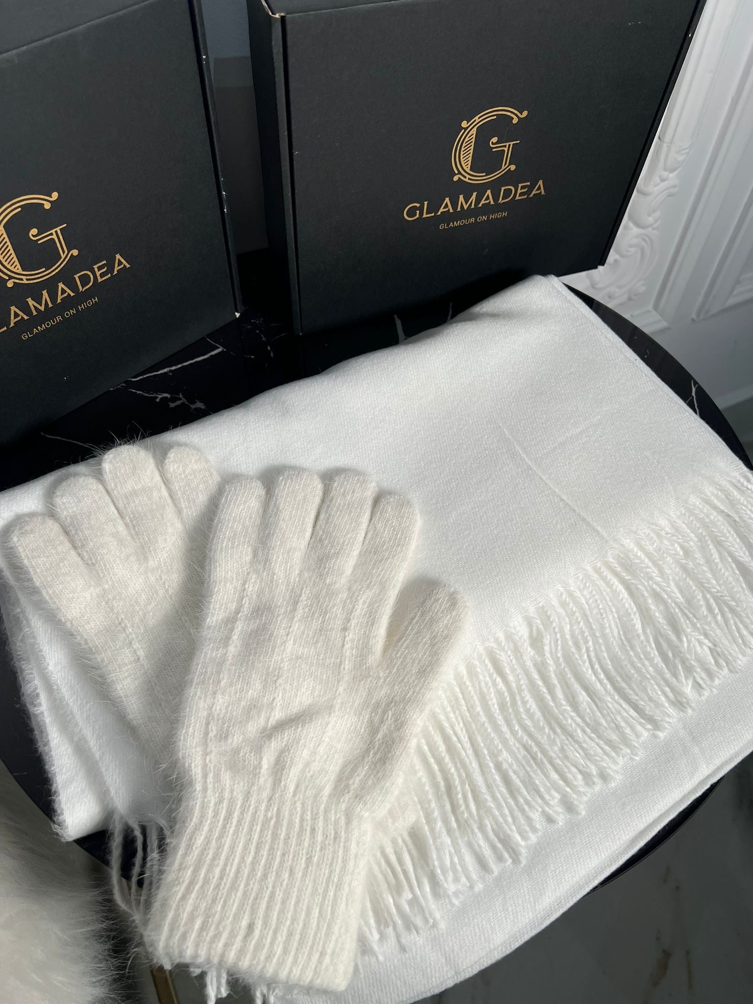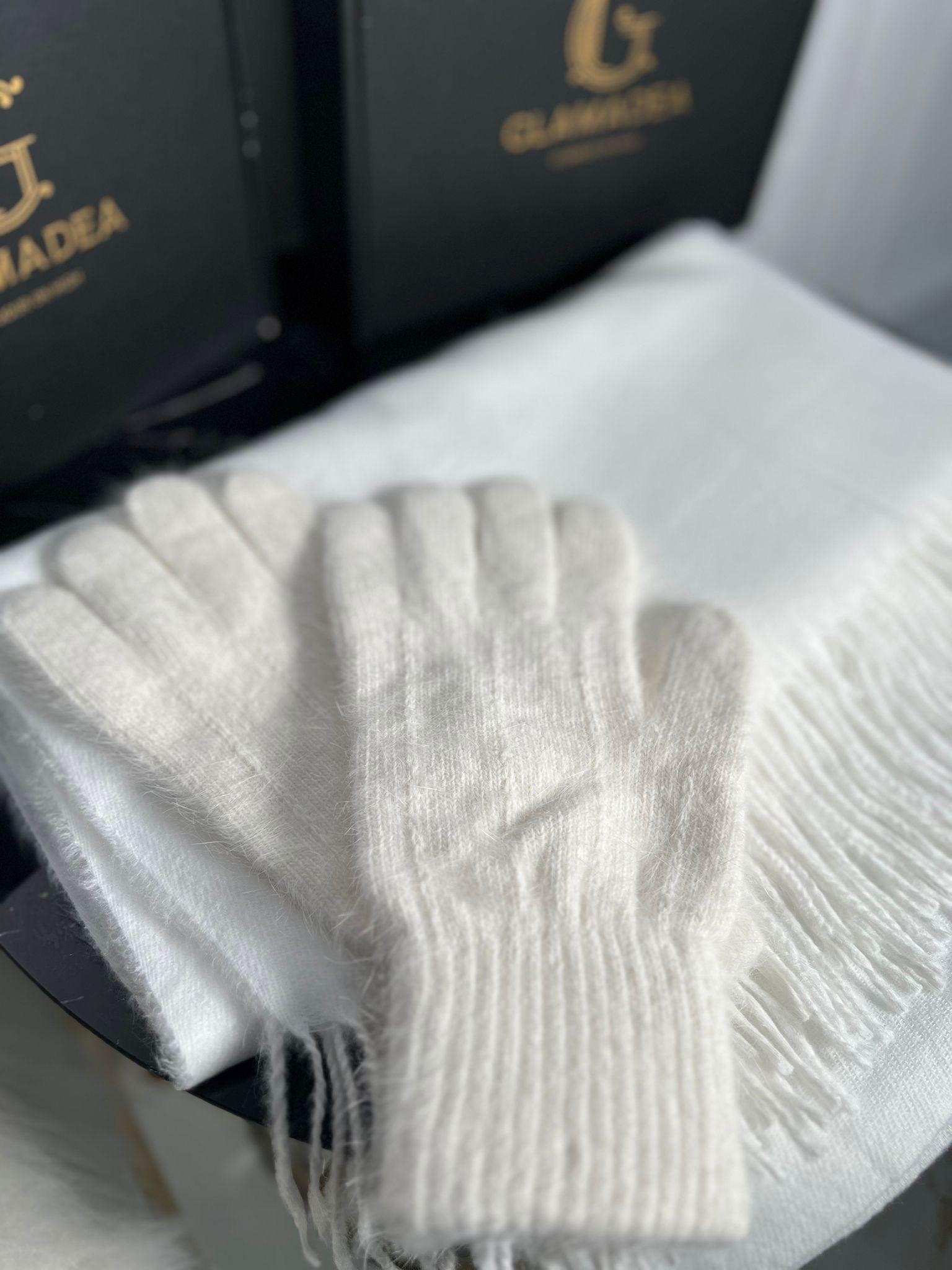 Set cadou manusi White din lana pufoasa si esarfa alba din cashmere delicat
