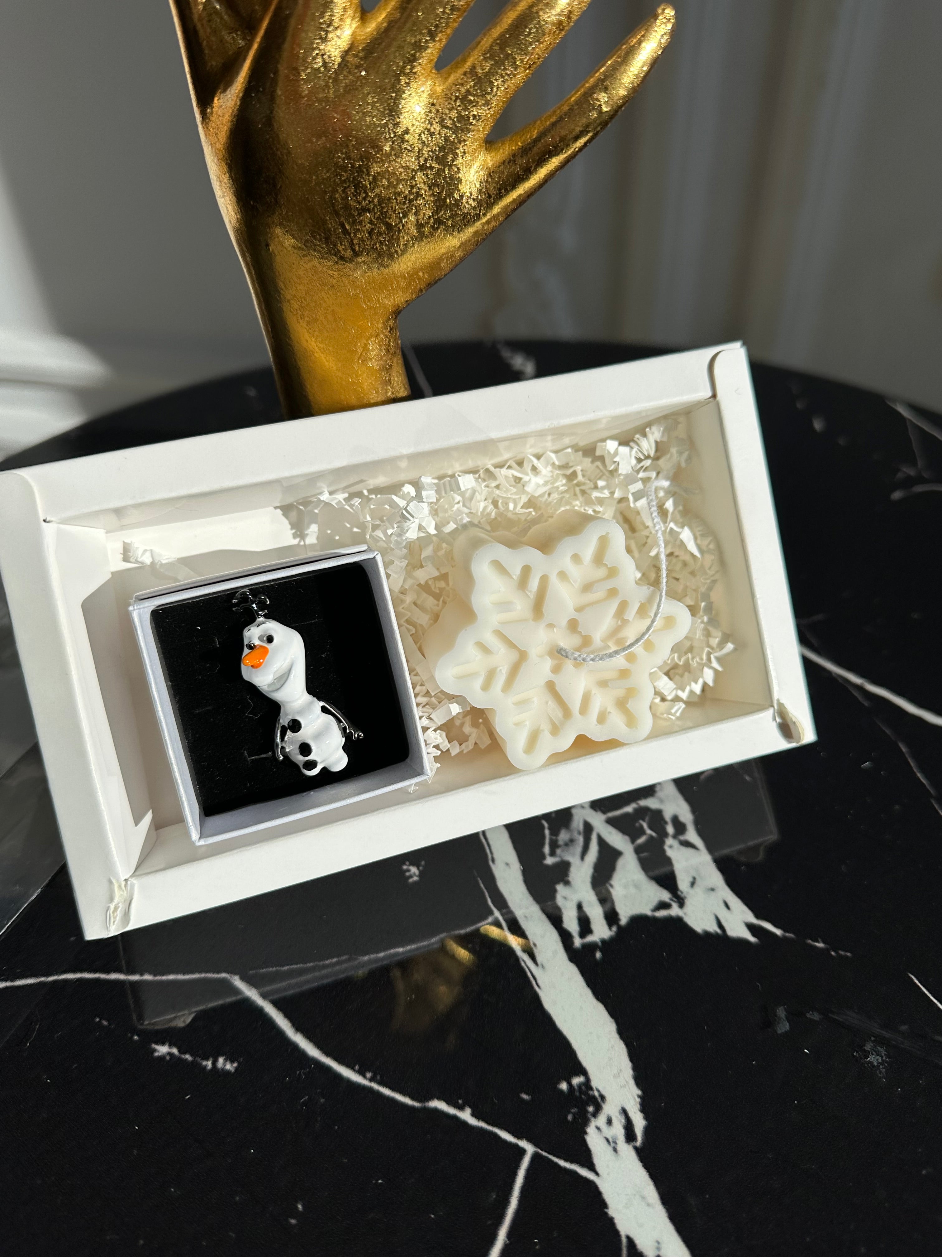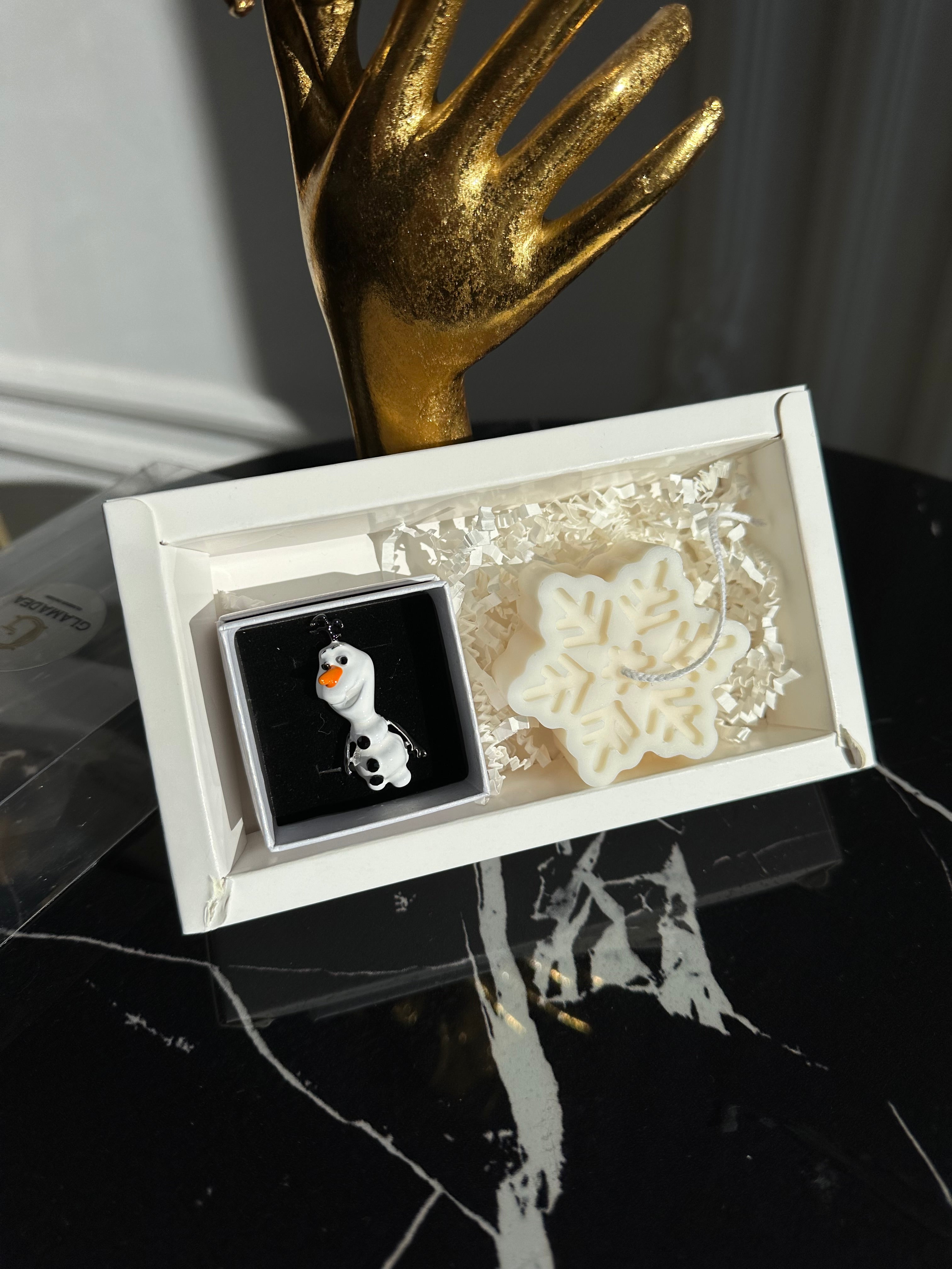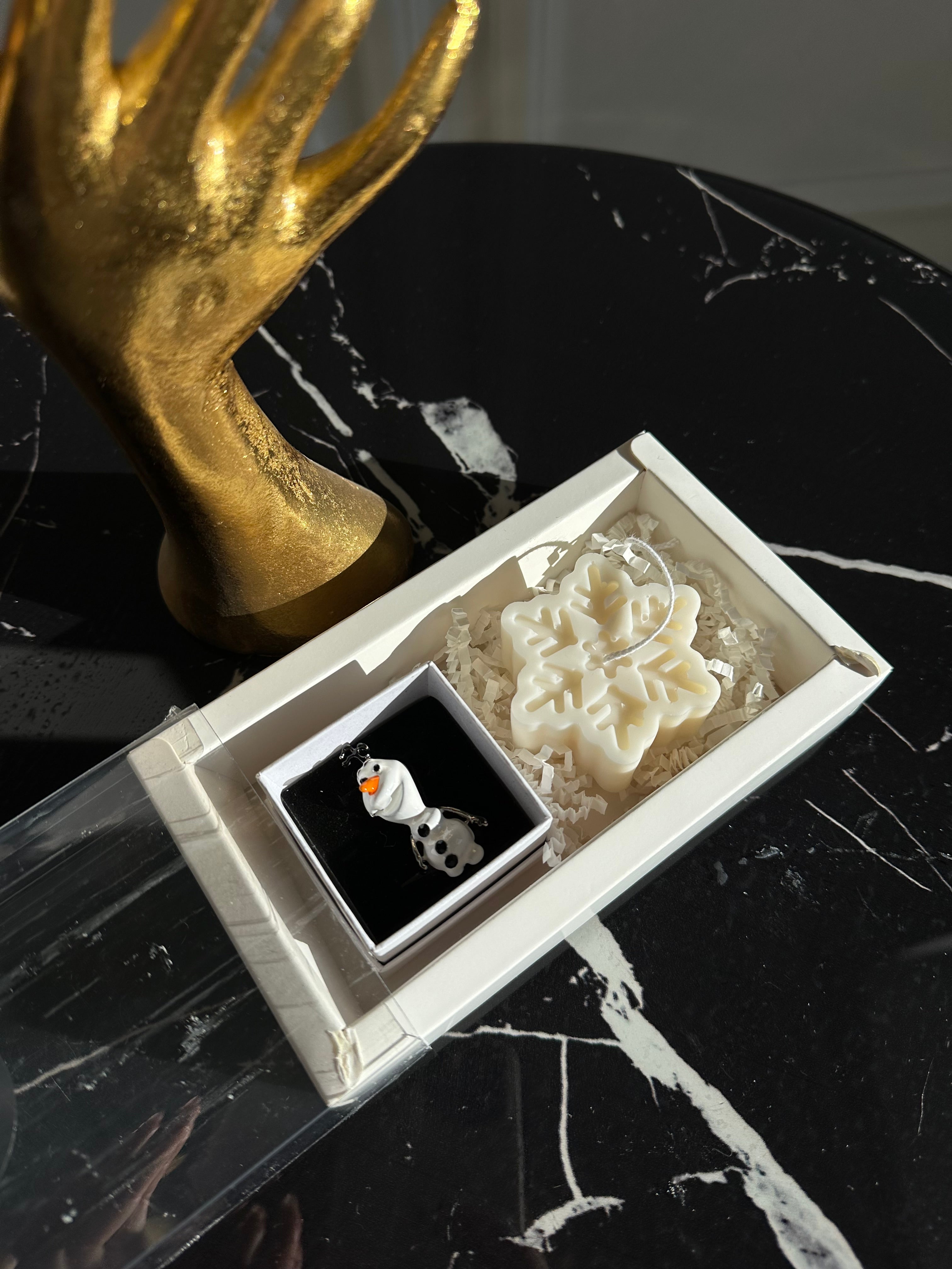 Set Cadou Sărbători – Broșă Frosty & Lumânare Fulg de Nea din Soia | Ambalaj Premium