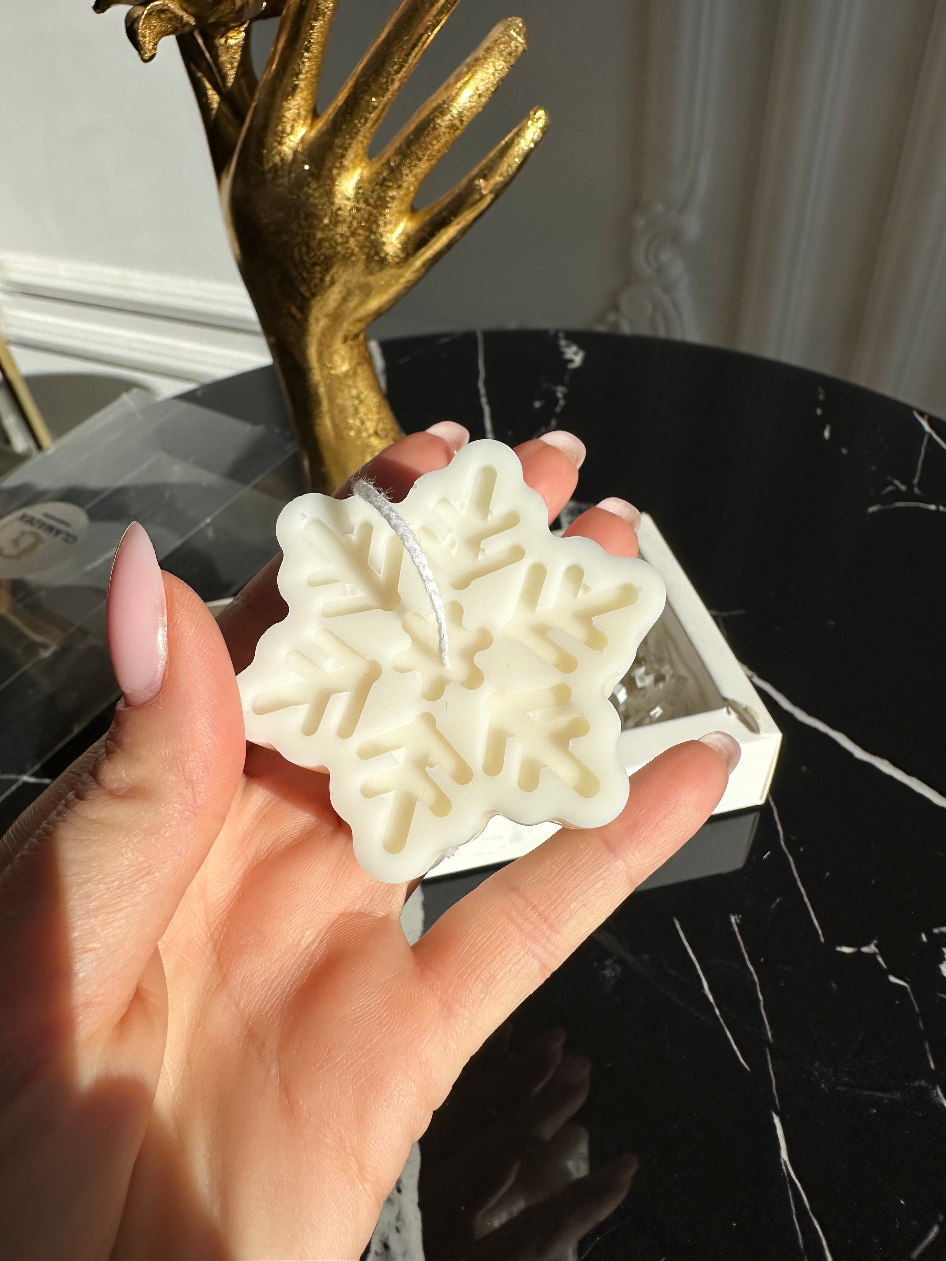 ✨ Lumânare Fulg de Nea – realizată din ceară de soia, arde curat și emană un parfum delicat, perfect pentru atmosfera de Crăciun.